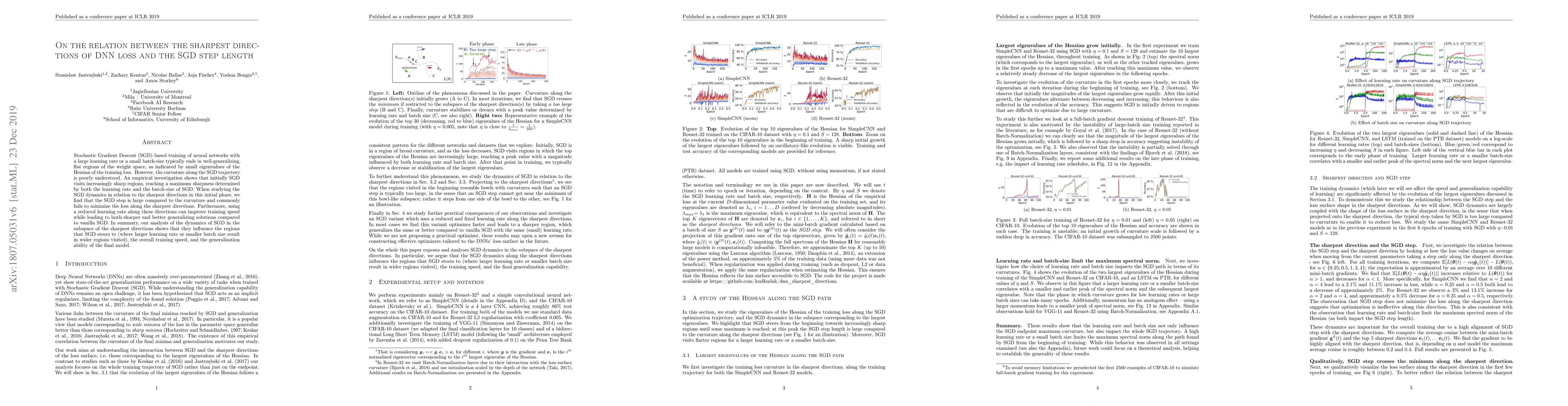 Stochastic Gradient Descent (SGD) based training of neural networks with a large learning rate or a small batch-size typically ends in well-generalizing, flat regions of the weight space, as indicated by small eigenvalues of the Hessian of the training loss. However, the curvature along the SGD trajectory is poorly understood. An empirical investigation shows that initially SGD visits increasingly sharp regions, reaching a maximum sharpness determined by both the learning rate and the batch-size of SGD. When studying the SGD dynamics in relation to the sharpest directions in this initial phase, we find that the SGD step is large compared to the curvature and commonly fails to minimize the loss along the sharpest directions. Furthermore, using a reduced learning rate along these directions can improve training speed while leading to both sharper and better generalizing solutions compared to vanilla SGD. In summary, our analysis of the dynamics of SGD in the subspace of the sharpest directions shows that they influence the regions that SGD steers to (where larger learning rate or smaller batch size result in wider regions visited), the overall training speed, and the generalization ability of the final model.