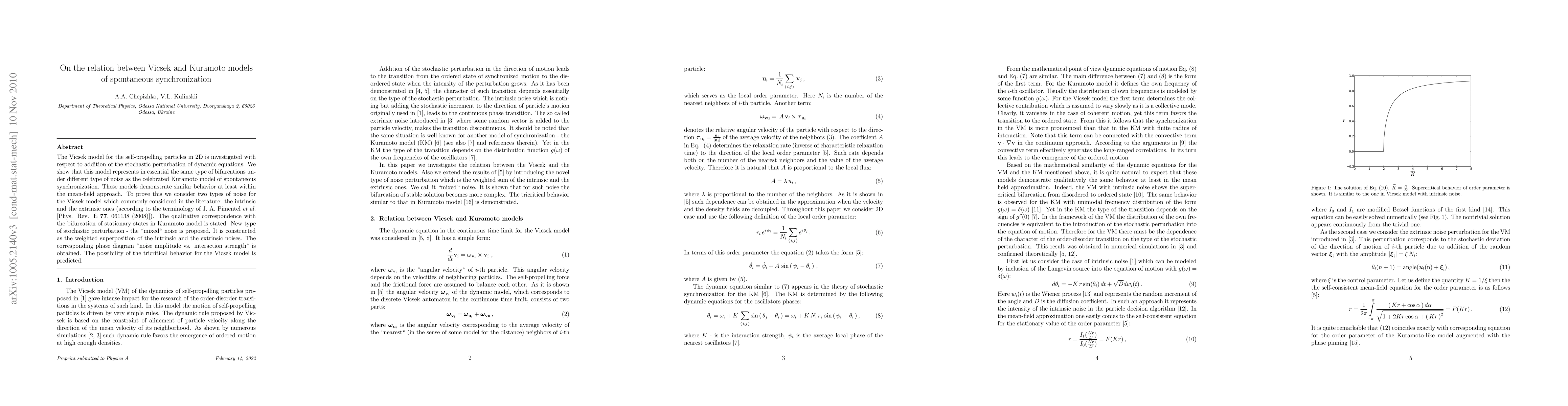 The Vicsek model for the self-propelled particles is investigated with the respect to the introduction of the stochastic perturbation of the dynamics. It is shown that such a dependence can be thought in terms of the isomorphism of the Vicsek model with the Kuramoto model of spontaneous synchronization. They are isomorphic at least within the mean-field approach. The isomorphism between two models allows to state the dependence of the type of the transition in Vicsek model on the noise perturbation. Two types of noise the scalar and the vector ones lead to qualitatively different behavior with continuous and the discontinuous transition to ordered state correspondingly. New type of the stochastic perturbation - ``mixed`` noise is proposed. It is the weighted superposition of the scalar and vector noises. The corresponding phase diagram ``noise amplitude vs. interaction strength`` is obtained and the tricritical behavior for Vicsek model is demonstrated.