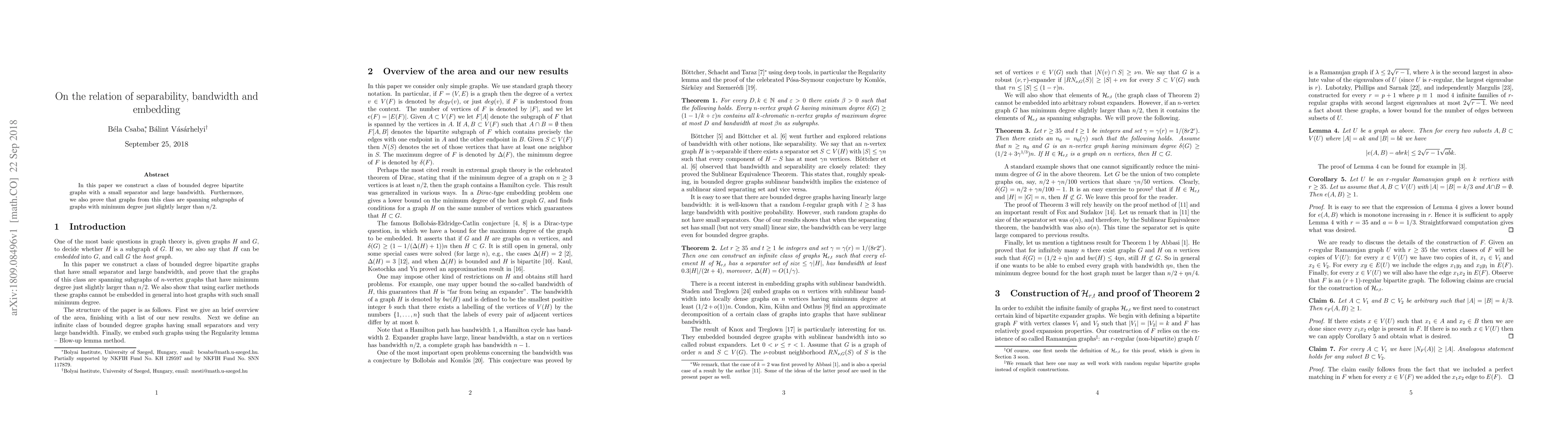 In this paper we construct a class of bounded degree bipartite graphs with a small separator and large bandwidth. Furthermore, we also prove that graphs from this class are spanning subgraphs of graphs with minimum degree just slightly larger than $n/2$.