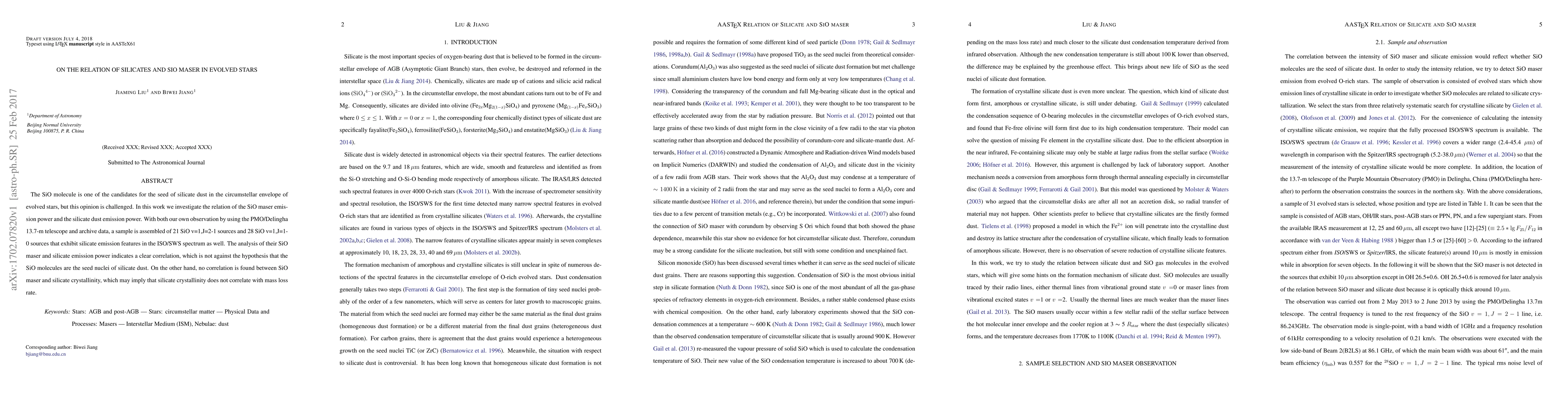 This study investigates the correlation between SiO maser emission power and silicate dust emission in evolved stars, finding a clear relationship that supports SiO molecules as potential seed nuclei for silicate dust. However, no correlation is observed between SiO maser and silicate crystallinity, suggesting silicate crystallinity may not be linked to mass loss rate.