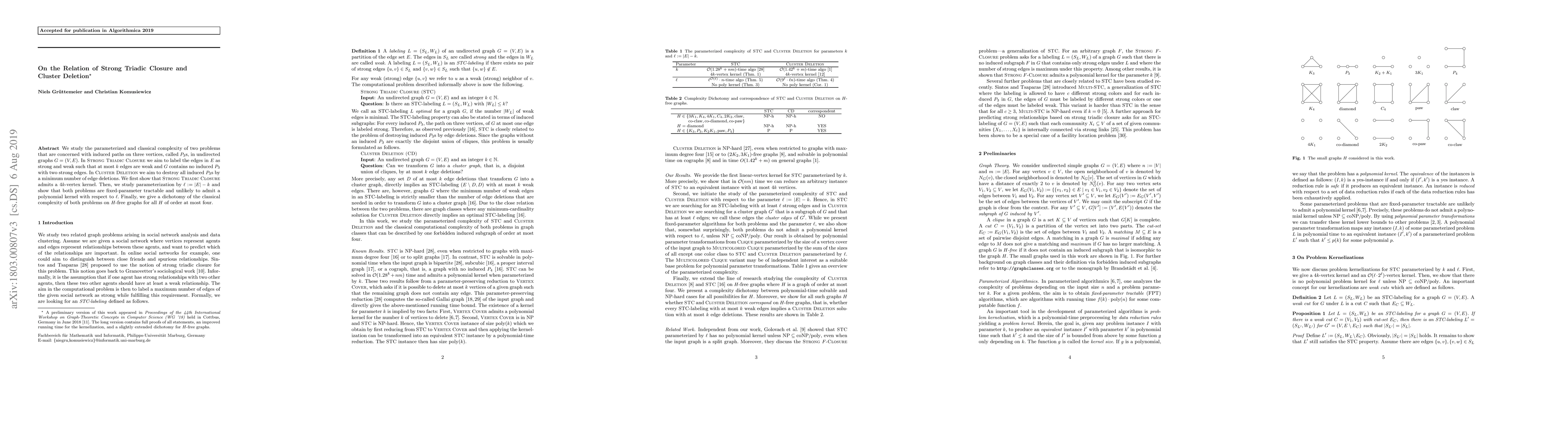 This paper explores the complexity of Strong Triadic Closure and Cluster Deletion problems in undirected graphs, proving that Strong Triadic Closure has a $4k$-vertex kernel and both problems are fixed-parameter tractable when parameterized by the number of edges minus the number of weak edges. It concludes with a complexity dichotomy for these problems on graphs that do not contain a specific four-vertex subgraph.