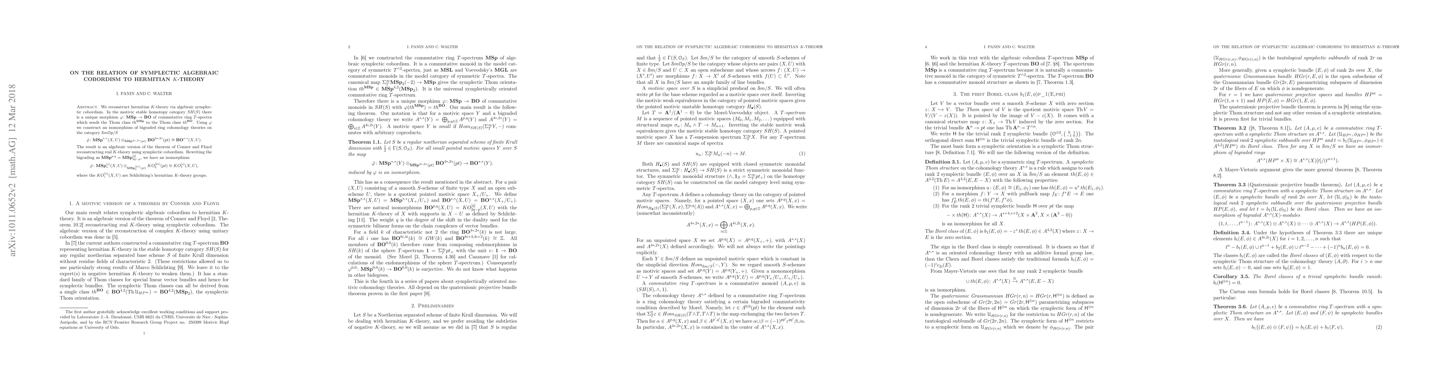 We reconstruct hermitian K-theory via algebraic symplectic cobordism. In the motivic stable homotopy category SH(S) there is a unique morphism g : MSp -> BO of commutative ring T- spectra which sends the Thom class th^{MSp} to the Thom class th^{BO}. We show that the induced morphism of bigraded cohomology theories MSp^{*,*} -> BO^{*,*} is isomorphic to the morphism of bigraded cohomology theories obtained by applying to MSp^{*,*} the "change of (simply graded) coefficients rings" MSp^{4*,2*} -> BO^{4*,2*}. This is an algebraic version of the theorem of Conner and Floyd reconstructing real K-theory via symplectic cobordism.