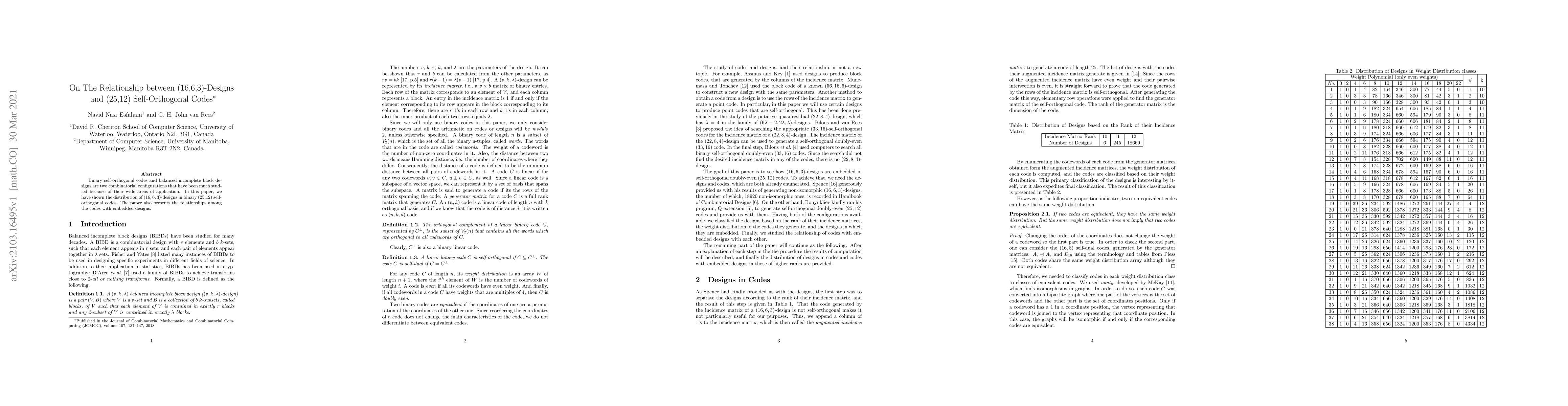 Binary self-orthogonal codes and balanced incomplete block designs are two combinatorial configurations that have been much studied because of their wide areas of application. In this paper, we have shown the distribution of (16; 6; 3)-designs in binary (25,12) self-orthogonal codes. The paper also presents the relationships among the codes with embedded designs.