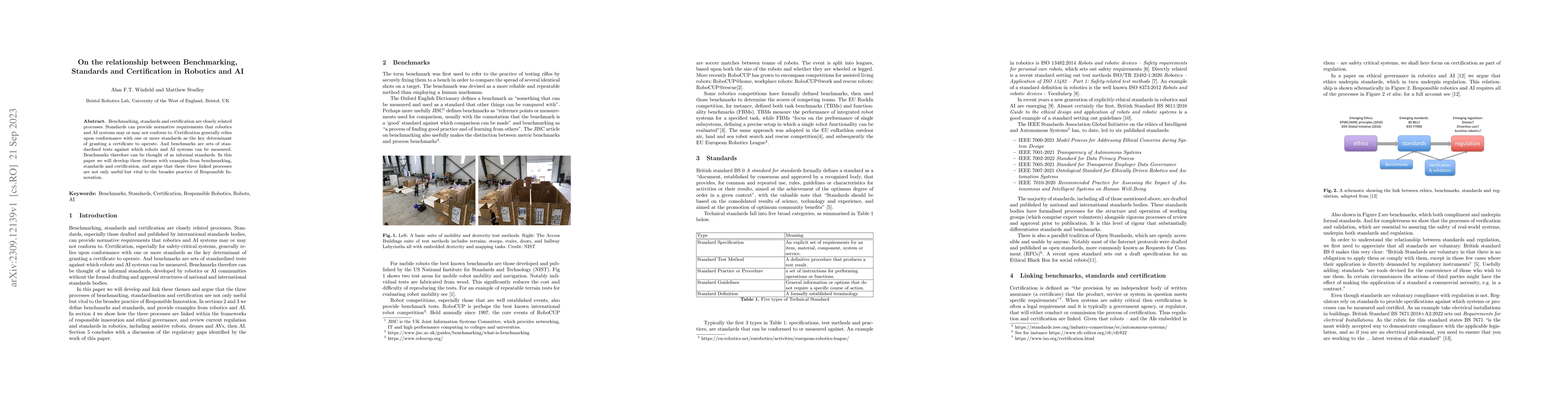 This paper explores the interconnected roles of benchmarking, standards, and certification in robotics and AI, emphasizing that these processes are essential for ensuring Responsible Innovation. It highlights how standards set normative requirements, certification relies on conformance to these standards, and benchmarks serve as informal standards for measuring performance.
