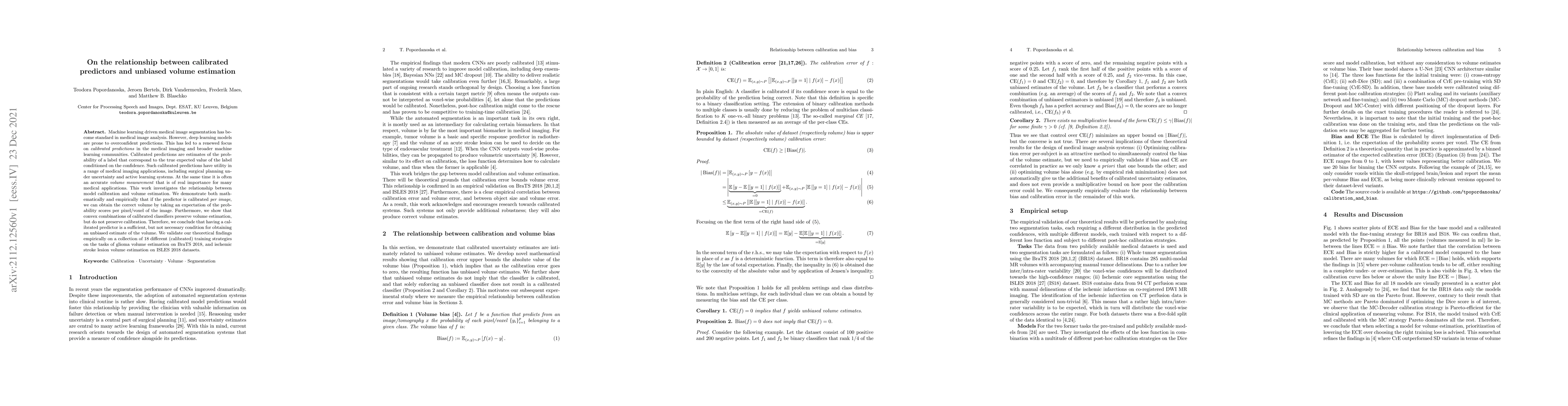 This paper explores the relationship between calibrated predictions and unbiased volume estimation in medical image segmentation. It demonstrates that a calibrated predictor ensures accurate volume estimation by averaging probability scores per pixel/voxel, but calibrated predictors are not required for unbiased volume estimation. Empirical validation on glioma and stroke lesion datasets supports these findings.