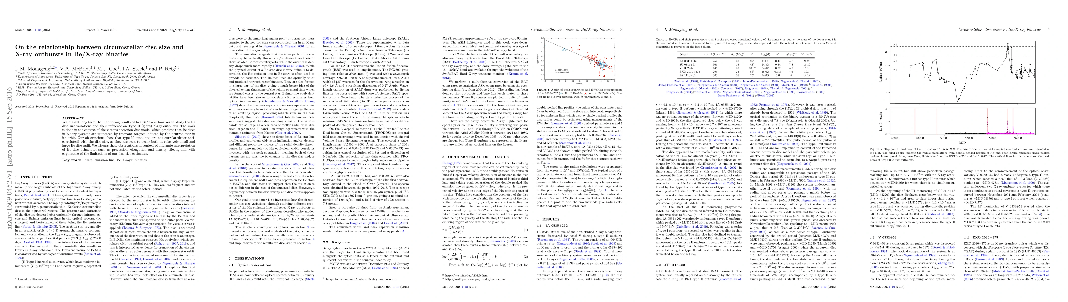 We present long term H$\alpha$ monitoring results of five Be/X-ray binaries to study the Be disc size variations and their influence on Type II (giant) X-ray outbursts. The work is done in the context of the viscous decretion disc model which predicts that Be discs in binary systems are truncated by resonant torques induced by the neutron star in its orbit. Our observations show that type II outbursts are not correlated(nor anti-correlated) with the disc size, as they are seen to occur both at relatively small and large Be disc radii. We discuss these observations in context of alternate interpretation of Be disc behaviour, such as precession, elongation and density effects, and with cognisance of the limitations of our disc size estimates.