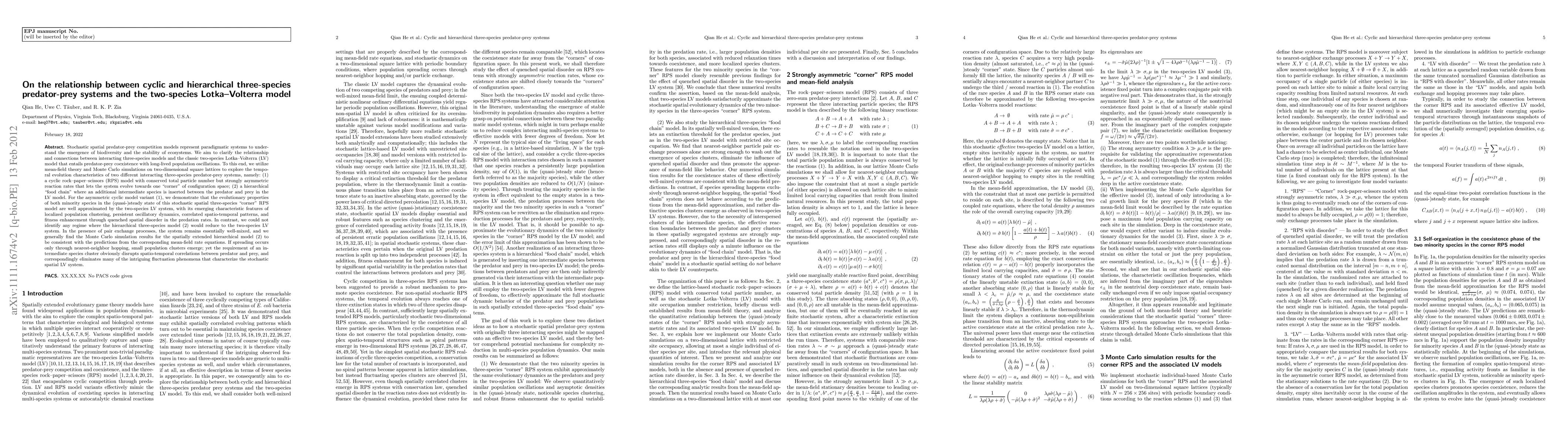 This paper investigates the relationship between two distinct three-species predator-prey systems and the two-species Lotka-Volterra (LV) model, finding that the cyclic RPS model's minority species dynamics closely resemble the LV system's properties, while the hierarchical food chain model does not reduce to the LV system, maintaining well-mixed dynamics and disrupting spatio-temporal correlations.