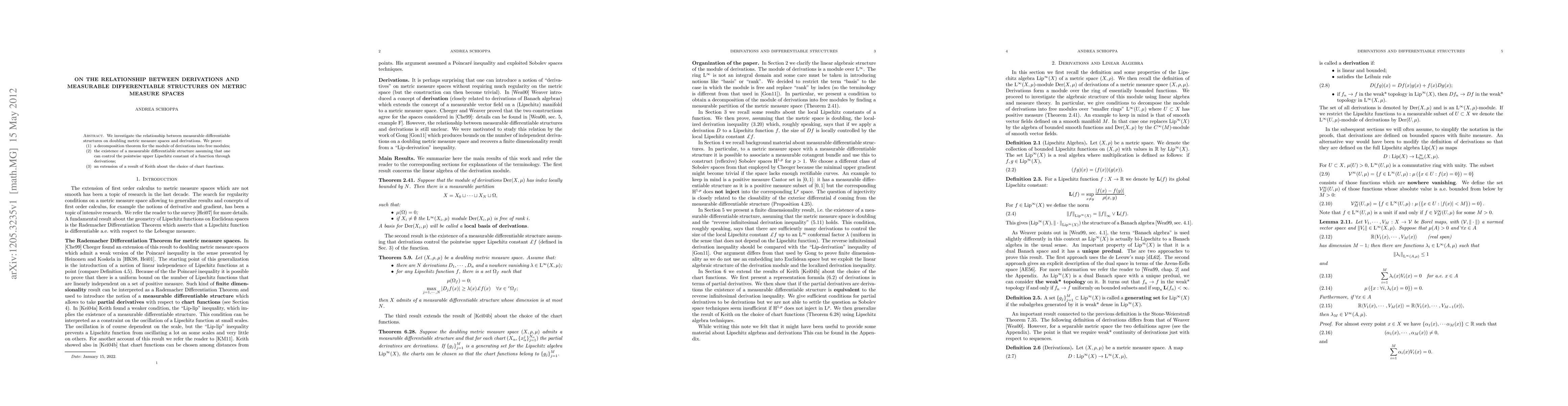 This paper explores the interplay between measurable differentiable structures on doubling metric measure spaces and derivations, establishing a decomposition theorem for derivations, proving the existence of a measurable differentiable structure under certain Lipschitz control conditions, and extending a result regarding chart functions.