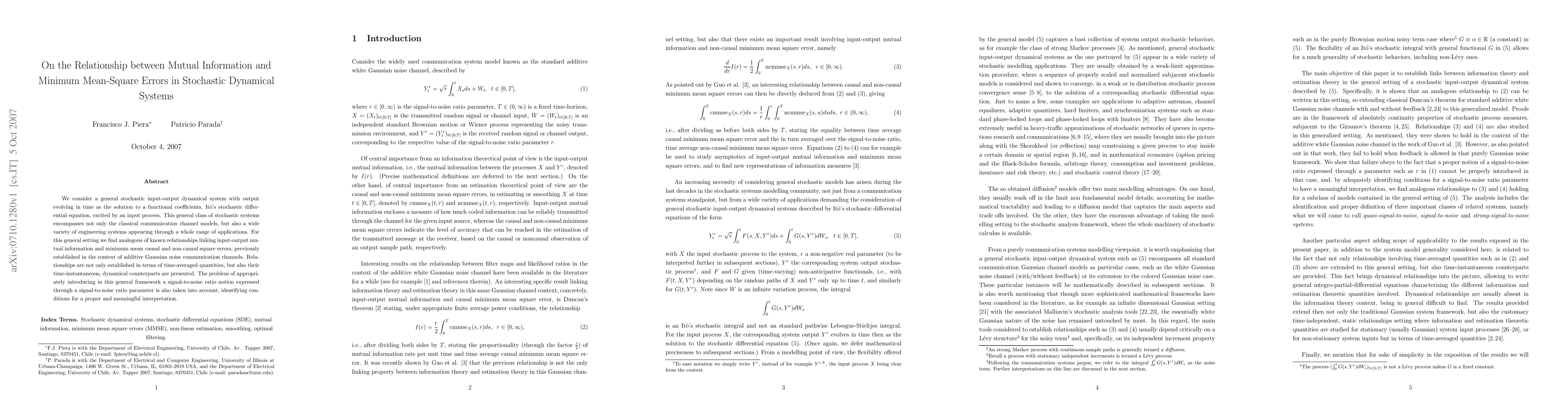 Researchers establish relationships between mutual information and minimum mean-square errors in stochastic dynamical systems, applying concepts from additive Gaussian noise communication channels to a broader range of engineering systems.