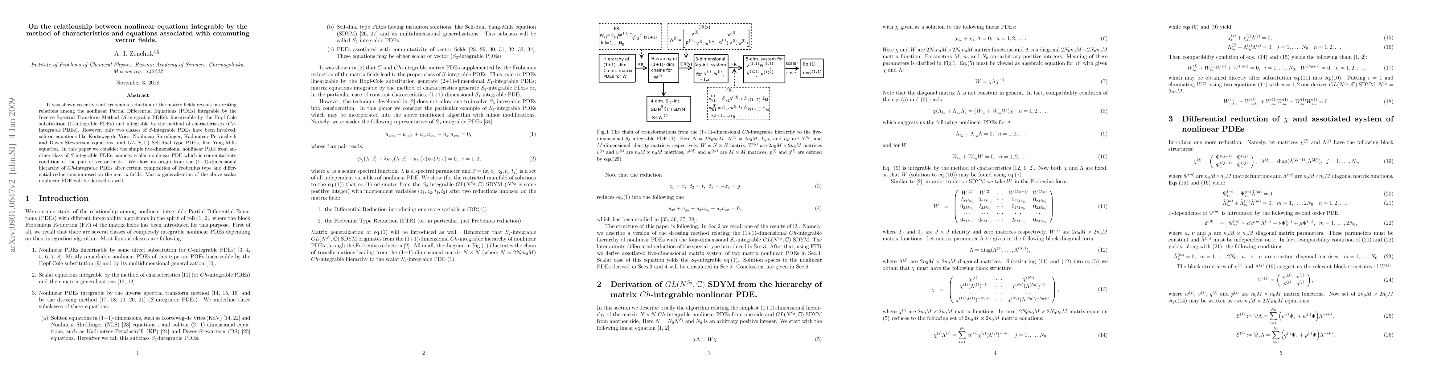 It was shown recently that Frobenius reduction of the matrix fields reveals interesting relations among the nonlinear Partial Differential Equations (PDEs) integrable by the Inverse Spectral Transform Method ($S$-integrable PDEs), linearizable by the Hoph-Cole substitution ($C$-integrable PDEs) and integrable by the method of characteristics ($Ch$-integrable PDEs). However, only two classes of $S$-integrable PDEs have been involved: soliton equations like Korteweg-de Vries, Nonlinear Shr\"odinger, Kadomtsev-Petviashvili and Davey-Stewartson equations, and $GL(N,\CC)$ Self-dual type PDEs, like Yang-Mills equation. In this paper we consider the simple five-dimensional nonlinear PDE from another class of $S$-integrable PDEs, namely, scalar nonlinear PDE which is commutativity condition of the pair of vector fields. We show its origin from the (1+1)-dimensional hierarchy of $Ch$-integrable PDEs after certain composition of Frobenius type and differential reductions imposed on the matrix fields. Matrix generalization of the above scalar nonlinear PDE will be derived as well.