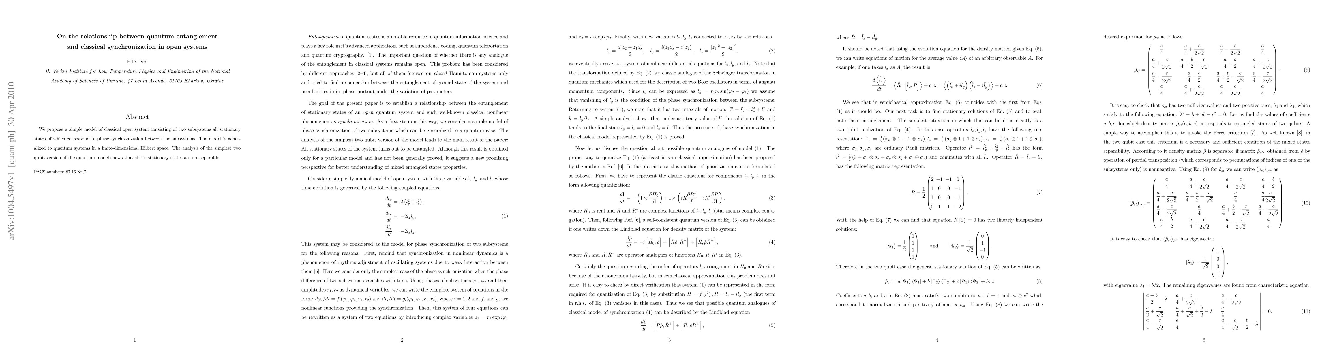 Summary: This paper proposes a classical model of open systems with phase synchronization, extending it to quantum systems where all two-qubit stationary states exhibit nonseparable entanglement. The study highlights the connection between classical synchronization and quantum entanglement in open systems.
