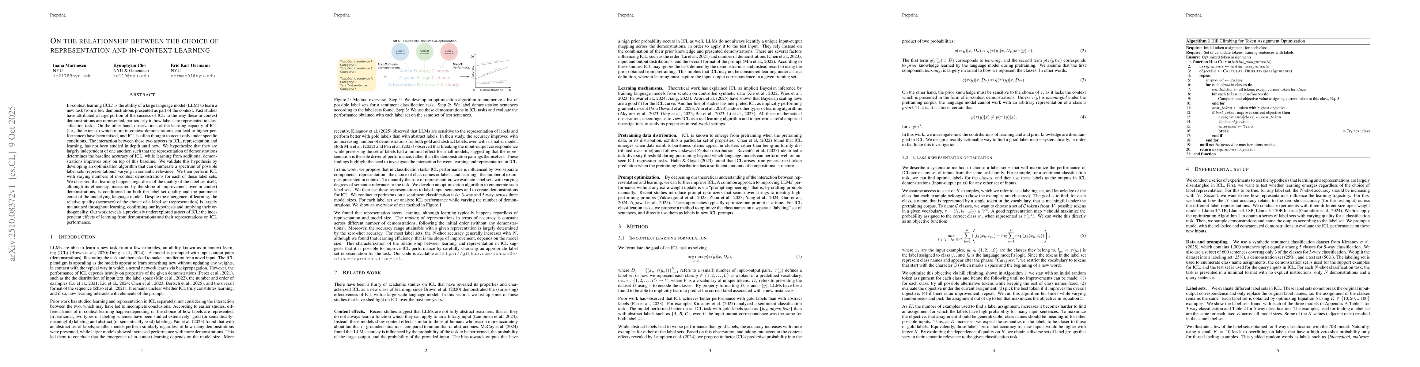 In-context learning (ICL) is the ability of a large language model (LLM) to learn a new task from a few demonstrations presented as part of the context. Past studies have attributed a large portion of the success of ICL to the way these in-context demonstrations are represented, particularly to how labels are represented in classification tasks. On the other hand, observations of the learning capacity of ICL (i.e., the extent to which more in-context demonstrations can lead to higher performance) have been mixed, and ICL is often thought to occur only under specific conditions. The interaction between these two aspects in ICL, representation and learning, has not been studied in depth until now. We hypothesize that they are largely independent of one another, such that the representation of demonstrations determines the baseline accuracy of ICL, while learning from additional demonstrations improves only on top of this baseline. We validate this hypothesis by developing an optimization algorithm that can enumerate a spectrum of possible label sets (representations) varying in semantic relevance. We then perform ICL with varying numbers of in-context demonstrations for each of these label sets. We observed that learning happens regardless of the quality of the label set itself, although its efficiency, measured by the slope of improvement over in-context demonstrations, is conditioned on both the label set quality and the parameter count of the underlying language model. Despite the emergence of learning, the relative quality (accuracy) of the choice of a label set (representation) is largely maintained throughout learning, confirming our hypothesis and implying their orthogonality. Our work reveals a previously underexplored aspect of ICL: the independent effects of learning from demonstrations and their representations on ICL performance.