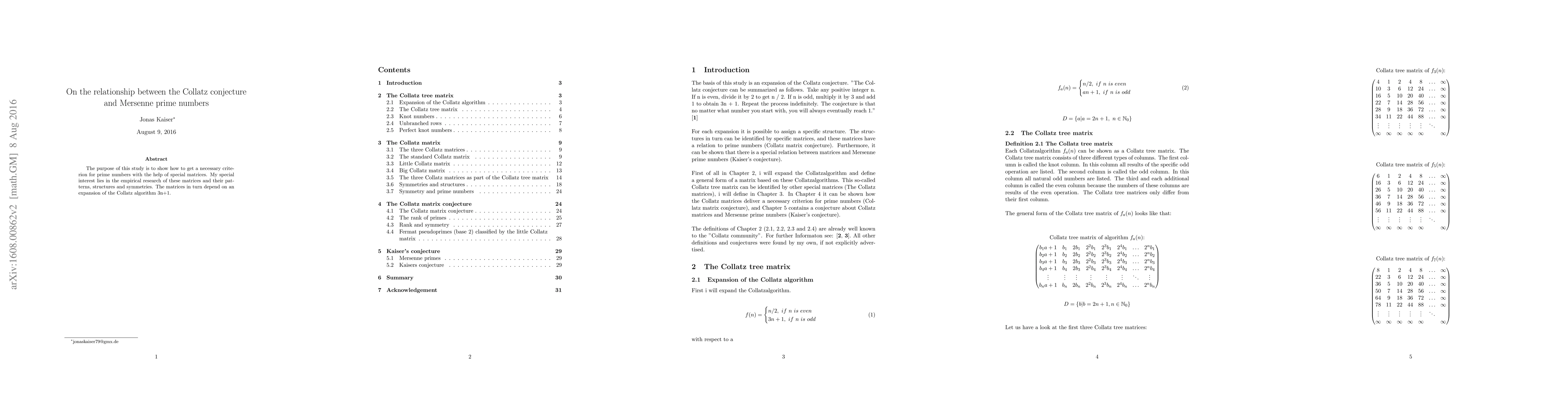 The purpose of this study is to show how to get a necessary criterion for prime numbers with the help of special matrices. My special interest lies in the empirical research of these matrices and their patterns, structures and symmetries. The matrices in turn depend on an expansion of the Collatz algorithm 3n+1.