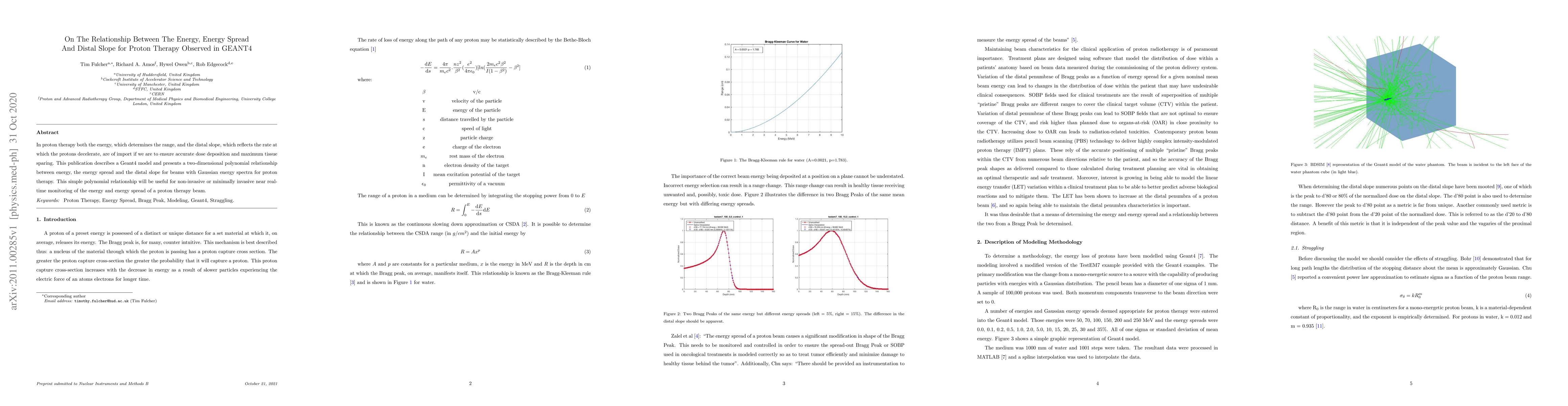 In proton therapy both the energy, which determines the range, and the distal slope, which reflects the rate at which the protons decelerate, are of import if we are to ensure accurate dose deposition and maximum tissue sparing. This publication describes a Geant4 model and presents a two-dimensional polynomial relationship between energy, the energy spread and the distal slope for beams with Gaussian energy spectra for proton therapy. This simple polynomial relationship will be useful for non-invasive or minimally invasive near real-time monitoring of the energy and energy spread of a proton therapy beam.