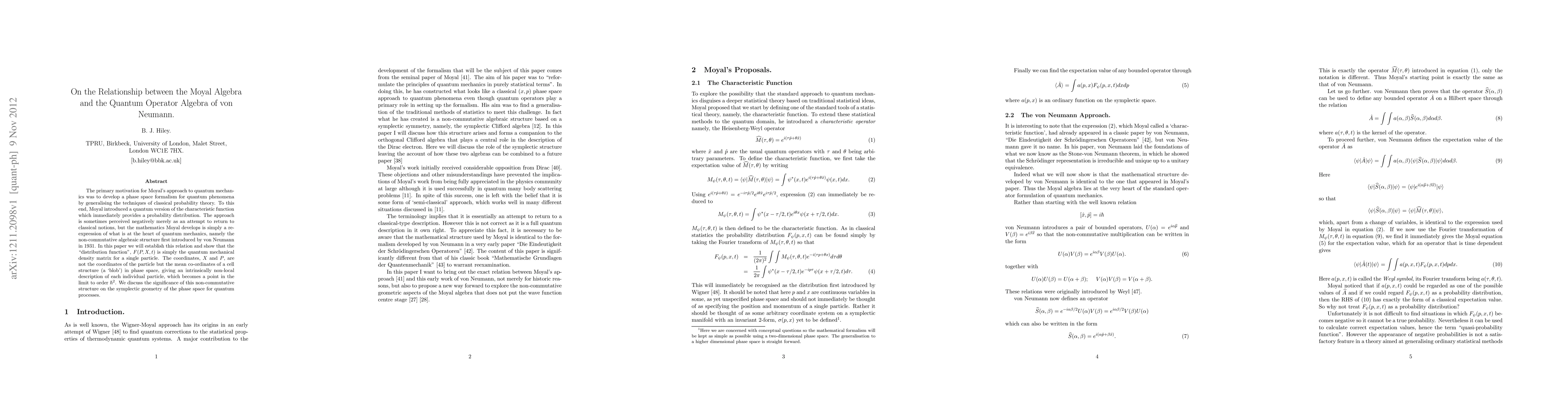 The primary motivation for Moyal's approach to quantum mechanics was to develop a phase space formalism for quantum phenomena by generalising the techniques of classical probability theory. To this end, Moyal introduced a quantum version of the characteristic function which immediately provides a probability distribution. The approach is sometimes perceived negatively merely as an attempt to return to classical notions, but the mathematics Moyal develops is simply a re-expression of what is at the heart of quantum mechanics, namely the non-commutative algebraic structure first introduced by von Neumann in 1931. In this paper we will establish this relation and show that the "distribution function", F(P,X,t) is simply the quantum mechanical density matrix for a single particle. The coordinates, X and P, are not the coordinates of the particle but the mean co-ordinates of a cell structure (a `blob') in phase space, giving an intrinsically non-local description of each individual particle, which becomes a point in the limit to order $\hbar^2$. We discuss the significance of this non-commutative structure on the symplectic geometry of the phase space for quantum processes.