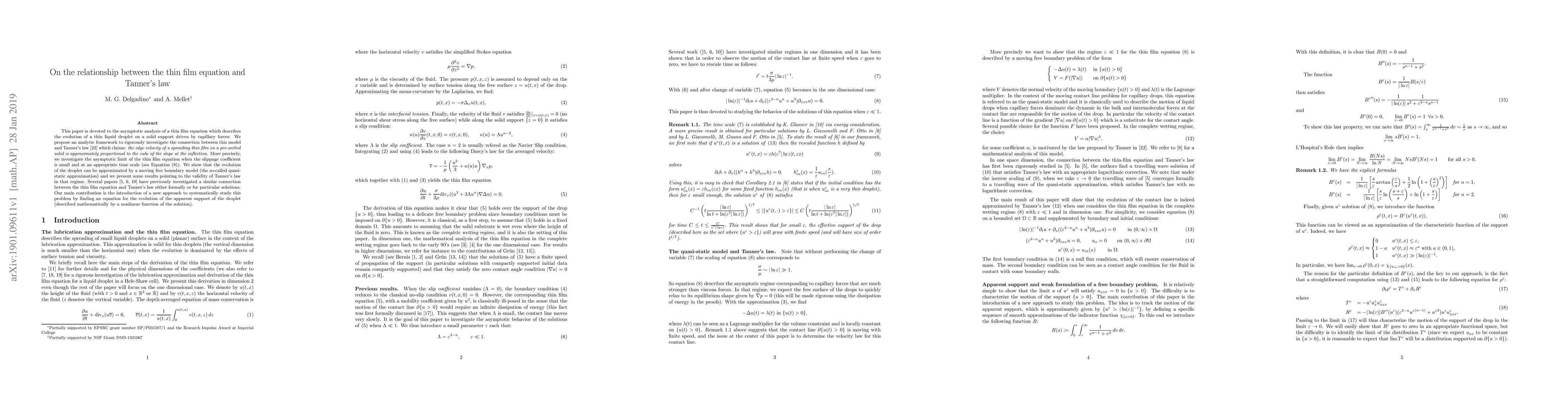 This paper analyzes the thin film equation to explore its connection with Tanner's law, showing that under small slippage and appropriate time scales, the droplet's evolution approximates a quasi-static model, validating Tanner's law. The study introduces a novel approach to systematically investigate this relationship by deriving an equation for the droplet's apparent support.
