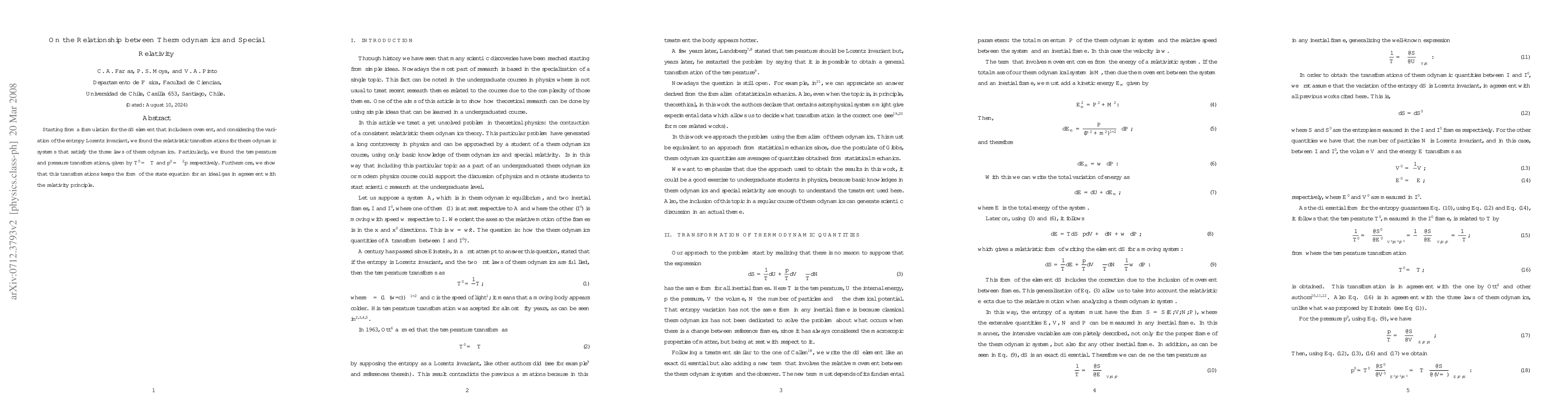 Researchers found relativistic transformations for thermodynamic systems that preserve the laws of thermodynamics, including temperature (T' = γT) and pressure (p' = γ^2p), keeping the ideal gas state equation consistent with special relativity.
