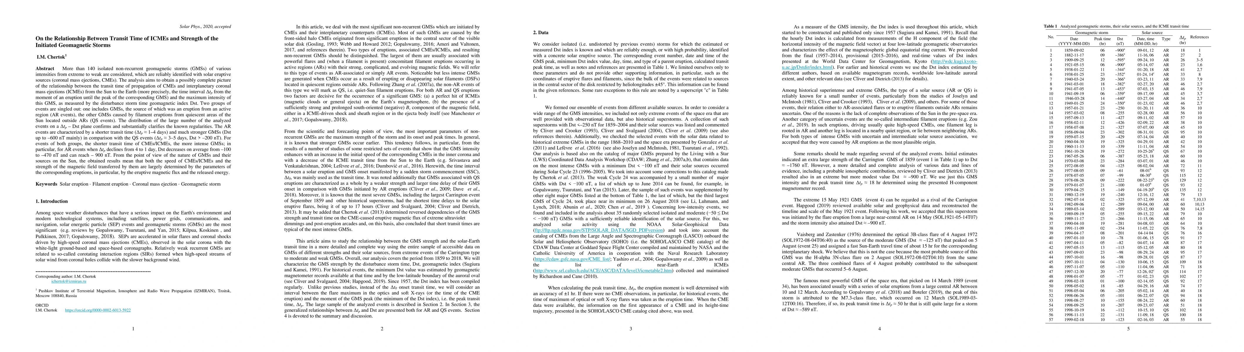 This paper investigates the relationship between the transit time of interplanetary coronal mass ejections (ICMEs) and the intensity of geomagnetic storms (GMSs) they initiate. It finds that storms from active regions (AR events) have shorter transit times and stronger GMSs compared to those from quiescent areas (QS events), indicating that eruption parameters like magnetic flux and energy significantly influence both transit speed and storm strength.