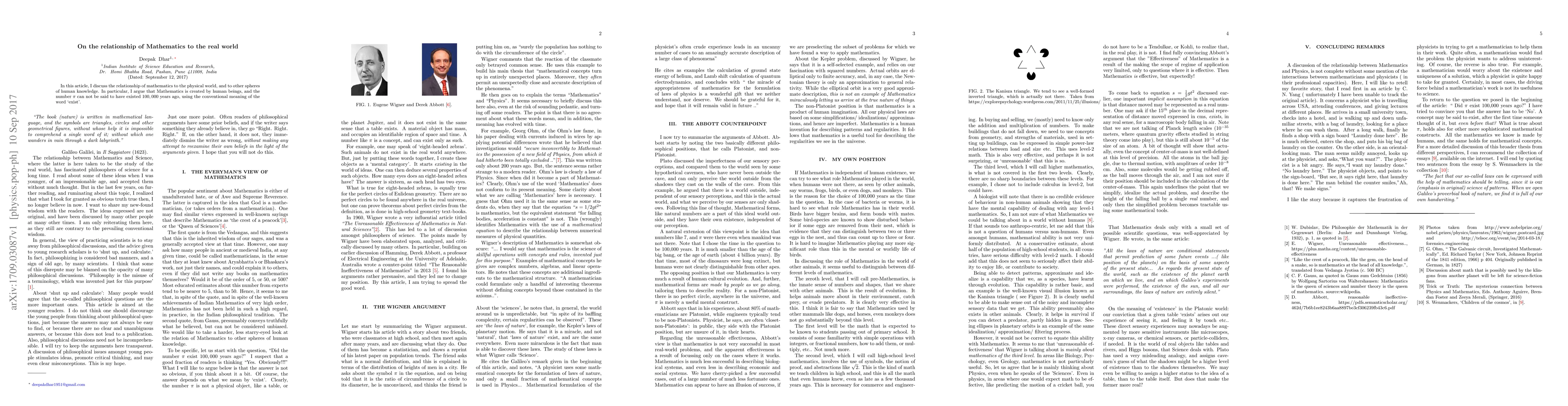In this article, I discuss the relationship of mathematics to the physical world, and to other spheres of human knowledge. In particular, I argue that Mathematics is created by human beings, and the number $\pi$ can not be said to have existed $100,000$ years ago, using the conventional meaning of the word `exist'.