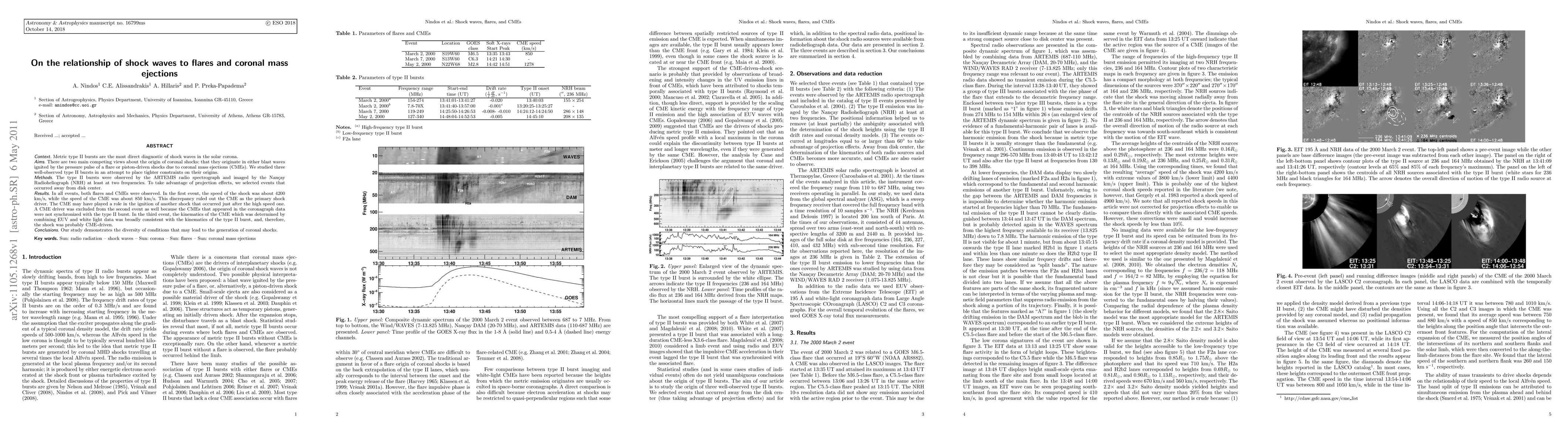 Context: Metric type II bursts are the most direct diagnostic of shock waves in the solar corona. Aims: There are two main competing views about the origin of coronal shocks: that they originate in either blast waves ignited by the pressure pulse of a flare or piston-driven shocks due to coronal mass ejections (CMEs). We studied three well-observed type II bursts in an attempt to place tighter constraints on their origins. Methods: The type II bursts were observed by the ARTEMIS radio spectrograph and imaged by the Nan\c{c}ay Radioheliograph (NRH) at least at two frequencies. To take advantage of projection effects, we selected events that occurred away from disk center. Results: In all events, both flares and CMEs were observed. In the first event, the speed of the shock was about 4200 km/s, while the speed of the CME was about 850 km/s. This discrepancy ruled out the CME as the primary shock driver. The CME may have played a role in the ignition of another shock that occurred just after the high speed one. A CME driver was excluded from the second event as well because the CMEs that appeared in the coronagraph data were not synchronized with the type II burst. In the third event, the kinematics of the CME which was determined by combining EUV and white light data was broadly consistent with the kinematics of the type II burst, and, therefore, the shock was probably CME-driven. Conclusions: Our study demonstrates the diversity of conditions that may lead to the generation of coronal shocks.