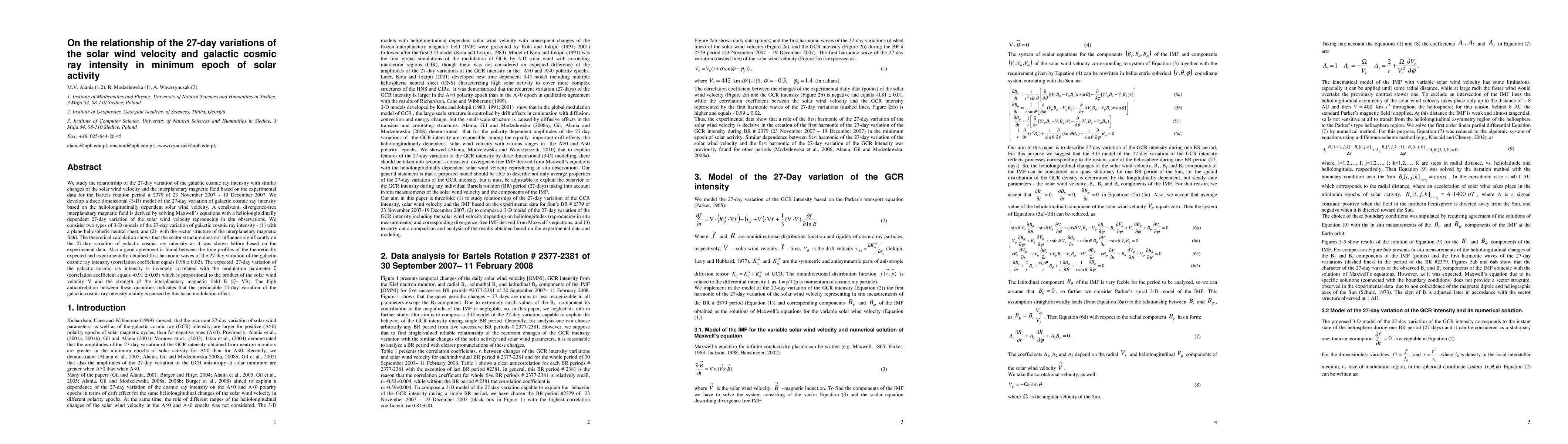 A study examines the 27-day variations of solar wind velocity and galactic cosmic ray intensity during periods of low solar activity, finding an inverse correlation between these two phenomena.