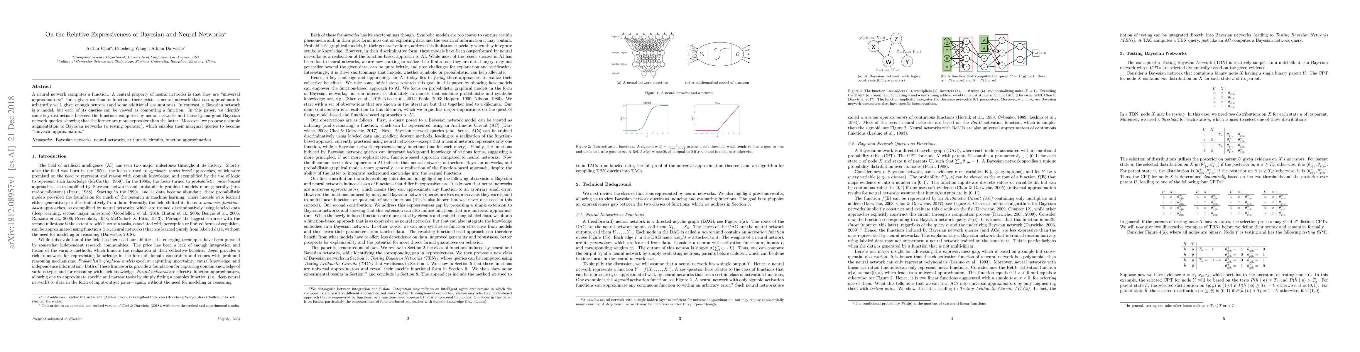 This paper explores the expressiveness of functions computed by neural networks versus Bayesian networks, concluding neural networks are more expressive. It introduces a 'testing operator' to make Bayesian network queries 'universal approximators'.