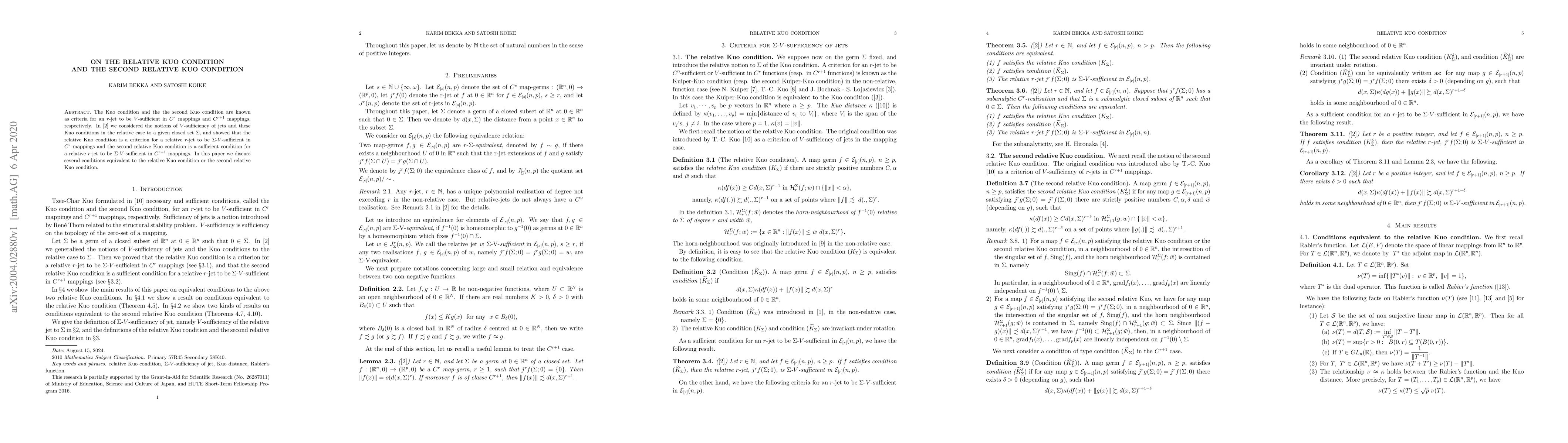 The Kuo condition and the the second Kuo condition are known as criteria for an r-jet to be V-sufficient in C^r mappings and C^{r+1} mappings, respectively. In a previous paper we considered the notions of V-sufficiency of jets and these Kuo conditions in the relative case to a given closed set, and showed that the relative Kuo condition is a criterion for a relative r-jet to be V-sufficient in C^r mappings and the second relative Kuo condition is a sufficient condition for a relative r-jet to be V-sufficient in C^{r+1} mappings. In this paper we discuss several conditions equivalent to the relative Kuo condition or the second relative Kuo condition.