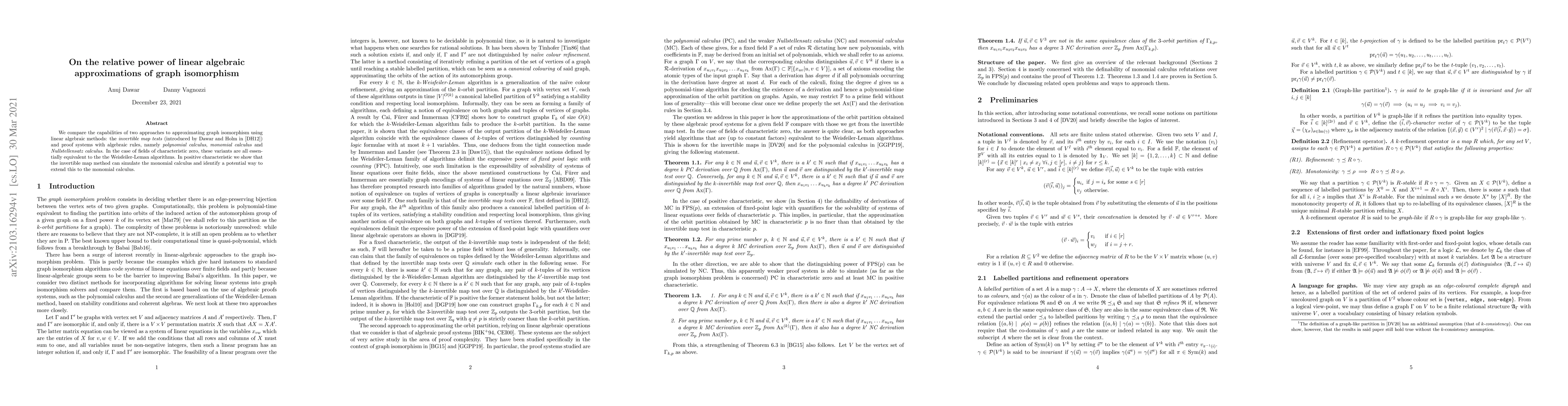 This paper compares two methods for approximating graph isomorphism using linear algebraic techniques, finding that one method can simulate the other in positive characteristic fields.
