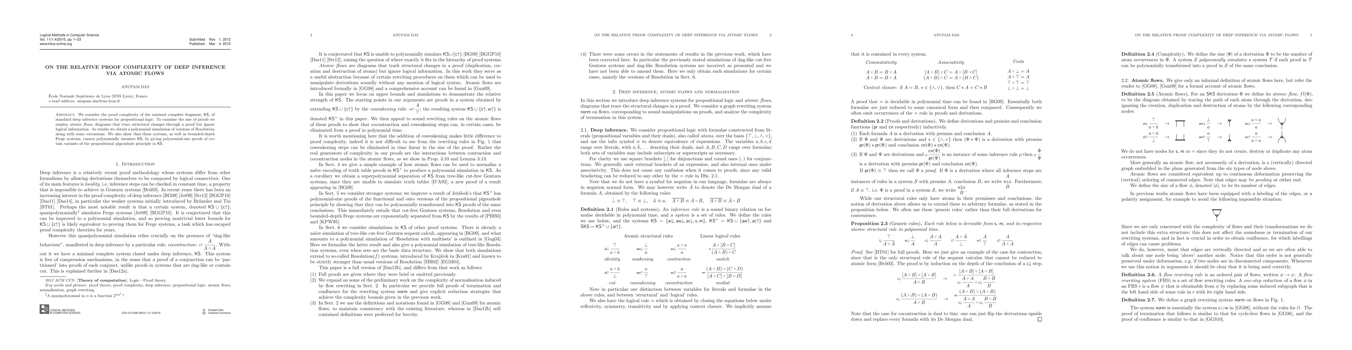 We consider the proof complexity of the minimal complete fragment, KS, of standard deep inference systems for propositional logic. To examine the size of proofs we employ atomic flows, diagrams that trace structural changes through a proof but ignore logical information. As results we obtain a polynomial simulation of versions of Resolution, along with some extensions. We also show that these systems, as well as bounded-depth Frege systems, cannot polynomially simulate KS, by giving polynomial-size proofs of certain variants of the propositional pigeonhole principle in KS.