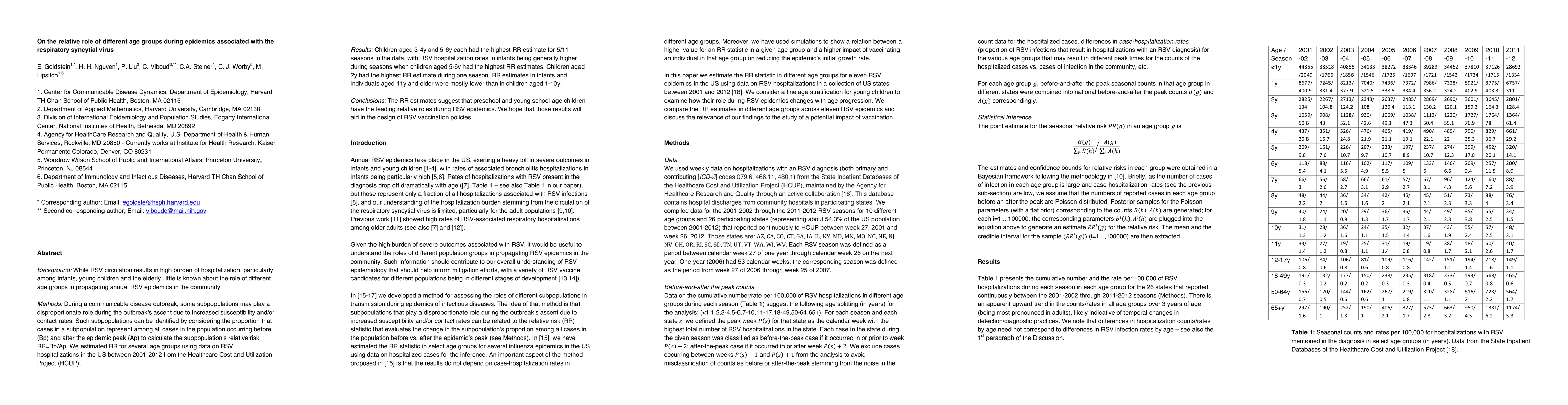 Background: While RSV circulation results in high burden of hospitalization, particularly among infants, young children and the elderly, little is known about the role of different age groups in propagating annual RSV epidemics in the community. Methods: During a communicable disease outbreak, some subpopulations may play a disproportionate role during the outbreak's ascent due to increased susceptibility and/or contact rates. Such subpopulations can be identified by considering the proportion that cases in a subpopulation represent among all cases in the population occurring before (Bp) and after the epidemic peak (Ap) to calculate the subpopulation's relative risk, RR=Bp/Ap. We estimated RR for several age groups using data on RSV hospitalizations in the US between 2001-2012 from the Healthcare Cost and Utilization Project (HCUP). Results: Children aged 3-4y and 5-6y each had the highest RR estimate for 5/11 seasons in the data, with RSV hospitalization rates in infants being generally higher during seasons when children aged 5-6y had the highest RR estimates. Children aged 2y had the highest RR estimate during one season. RR estimates in infants and individuals aged 11y and older were mostly lower than in children aged 1-10y. Conclusions: The RR estimates suggest that preschool and young school-age children have the leading relative roles during RSV epidemics. We hope that those results will aid in the design of RSV vaccination policies.