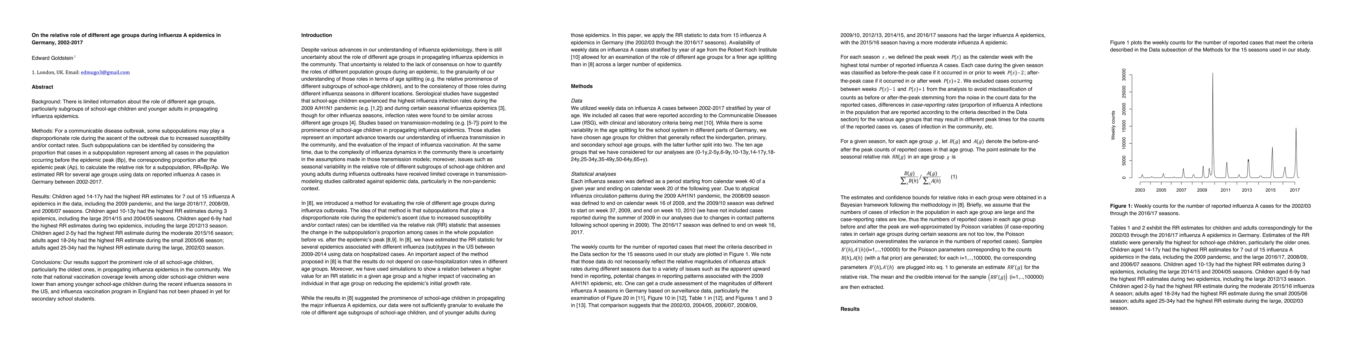 This study analyzed the relative role of different age groups in propagating influenza A epidemics in Germany from 2002-2017. It found that school-age children, especially those aged 14-17 years, played a significant role in several epidemics, including the 2009 pandemic, indicating the importance of targeted vaccination strategies for this subgroup.