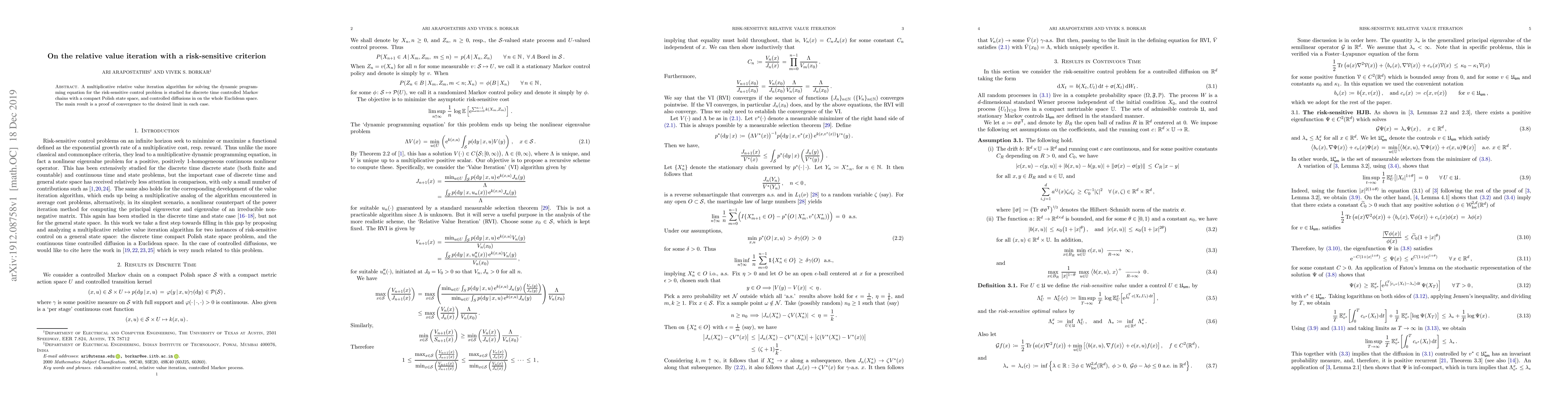 A multiplicative relative value iteration algorithm for solving the dynamic programming equation for the risk-sensitive control problem is studied for discrete time controlled Markov chains with a compact Polish state space, and controlled diffusions in on the whole Euclidean space. The main result is a proof of convergence to the desired limit in each case.