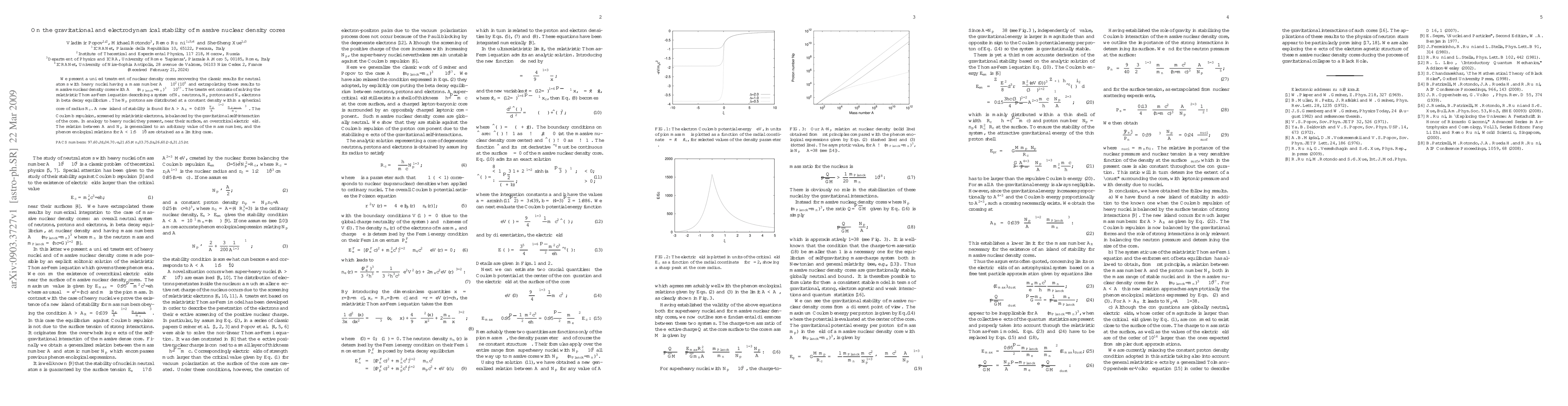 This paper explores the relativistic and electrodynamical stability of massive nuclear density cores, solving the relativistic Thomas-Fermi equation to describe neutron, proton, and electron interactions. It identifies a new island of stability for extremely large mass numbers, balancing Coulomb repulsion with gravitational self-interaction.