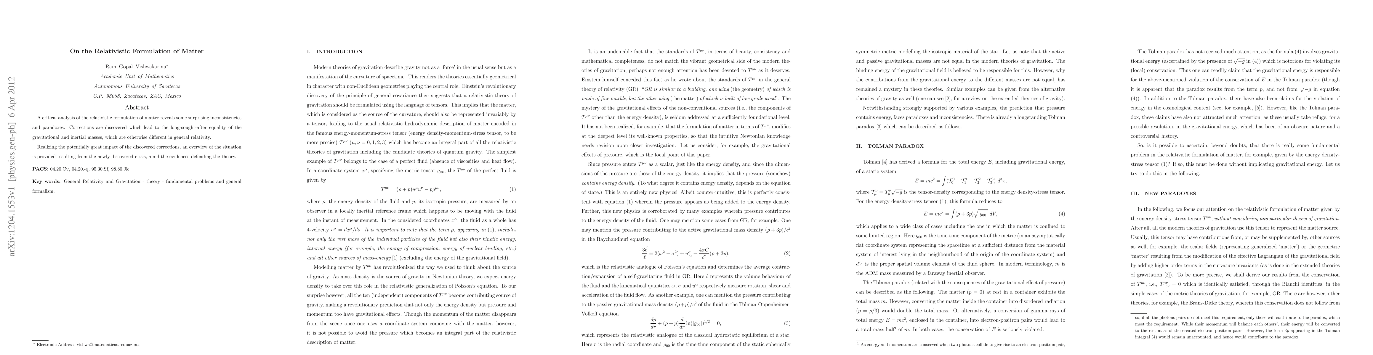 A critical analysis of the relativistic formulation of matter reveals some surprising inconsistencies and paradoxes. Corrections are discovered which lead to the long-sought-after equality of the gravitational and inertial masses, which are otherwise different in general relativity. Realizing the potentially great impact of the discovered corrections, an overview of the situation is provided resulting from the newly discovered crisis, amid the evidences defending the theory.