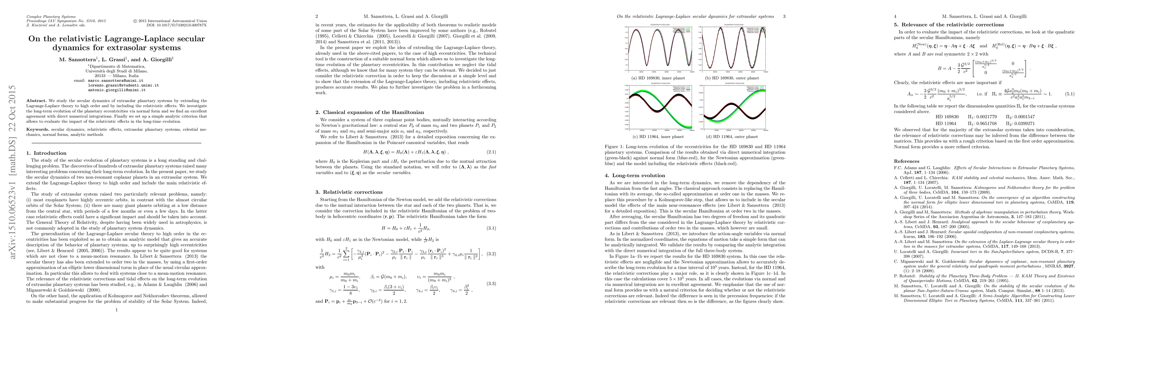This paper extends the Lagrange-Laplace theory to high order and incorporates relativistic effects to study the secular dynamics of extrasolar planetary systems, finding good agreement with numerical simulations and establishing a new analytic criterion for assessing relativistic impacts on long-term planetary evolution.