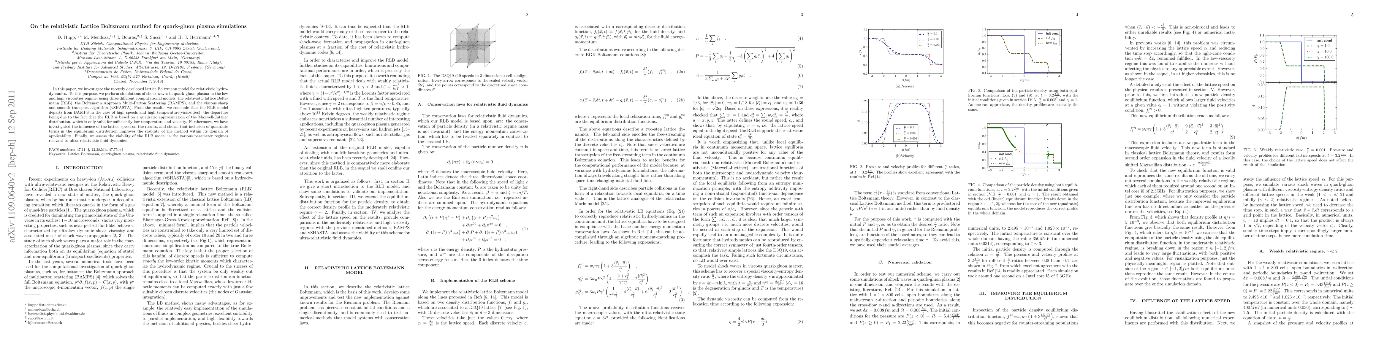 In this paper, we investigate the recently developed lattice Boltzmann model for relativistic hydrodynamics. To this purpose, we perform simulations of shock waves in quark-gluon plasma in the low and high viscosities regime, using three different computational models, the relativistic lattice Boltzmann (RLB), the Boltzmann Approach Multi-Parton Scattering (BAMPS), and the viscous sharp and smooth transport algorithm (vSHASTA). From the results, we conclude that the RLB model departs from BAMPS in the case of high speeds and high temperature(viscosities), the departure being due to the fact that the RLB is based on a quadratic approximation of the Maxwell-J\"uttner distribution, which is only valid for sufficiently low temperature and velocity. Furthermore, we have investigated the influence of the lattice speed on the results, and shown that inclusion of quadratic terms in the equilibrium distribution improves the stability of the method within its domain of applicability. Finally, we assess the viability of the RLB model in the various parameter regimes relevant to ultra-relativistic fluid dynamics.