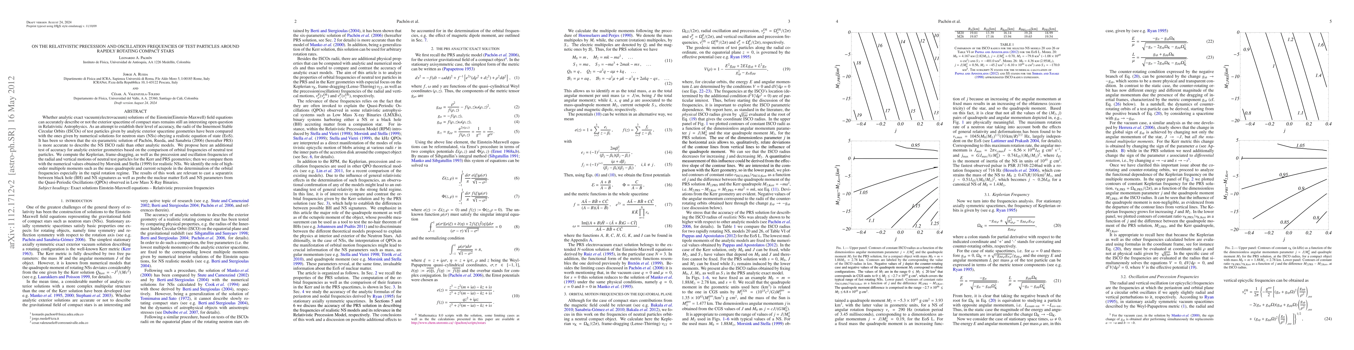 Whether analytic exact vacuum(electrovacuum) solutions of the Einstein(Einstein-Maxwell) field equations can accurately describe or not the exterior spacetime of compact stars remains still an interesting open question in Relativistic Astrophysics. As an attempt to establish their level of accuracy, the radii of the Innermost Stable Circular Orbits (ISCOs) of test particles given by analytic exterior spacetime geometries have been compared with the ones given by numerical solutions for neutron stars (NSs) obeying a realistic equation of state (EoS). It has been so shown that the six-parametric solution of Pach\'on, Rueda, and Sanabria (2006) (hereafter PRS) is more accurate to describe the NS ISCO radii than other analytic models. We propose here an additional test of accuracy for analytic exterior geometries based on the comparison of orbital frequencies of neutral test particles. We compute the Keplerian, frame-dragging, as well as the precession and oscillation frequencies of the radial and vertical motions of neutral test particles for the Kerr and PRS geometries; then we compare them with the numerical values obtained by Morsink and Stella (1999) for realistic NSs. We identify the role of high-order multipole moments such as the mass quadrupole and current octupole in the determination of the orbital frequencies especially in the rapid rotation regime. The results of this work are relevant to cast a separatrix between black hole (BH) and NS signatures as well as probe the nuclear matter EoS and NS parameters from the Quasi-Periodic Oscillations (QPOs) observed in Low Mass X-Ray Binaries.