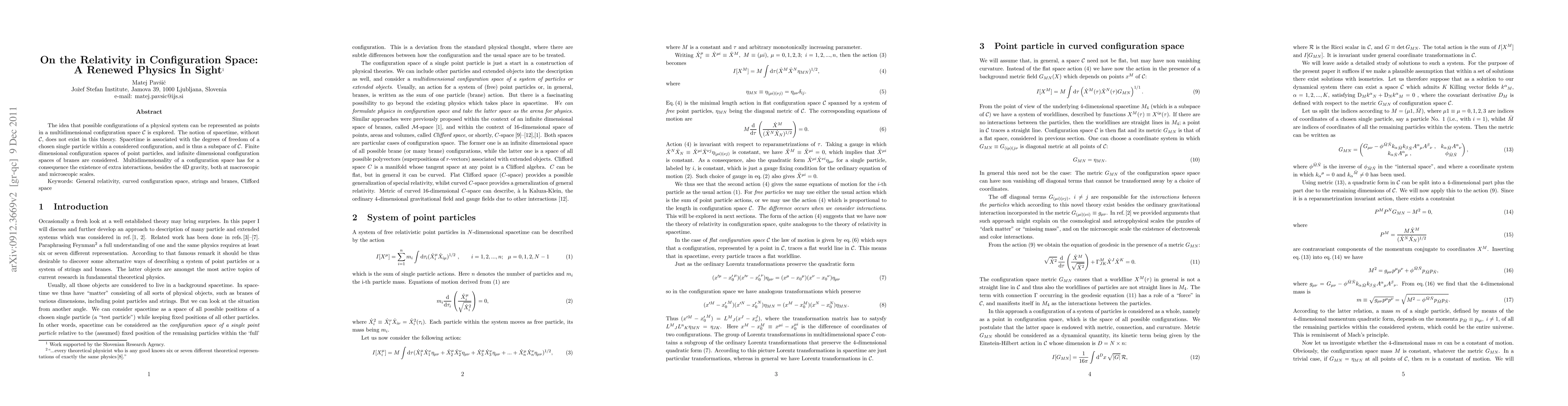 The idea that possible configurations of a physical system can be represented as points in a multidimensional configuration space ${\cal C}$ is explored. The notion of spacetime, without ${\cal C}$, does not exist in this theory. Spacetime is associated with the degrees of freedom of a chosen single particle within a considered configuration, and is thus a subspace of ${\cal C}$. Finite dimensional configuration spaces of point particles, and infinite dimensional configuration spaces of branes are considered. Multidimensionality of a configuration space has for a consequence the existence of extra interactions, besides the 4D gravity, both at macroscopic and microscopic scales.