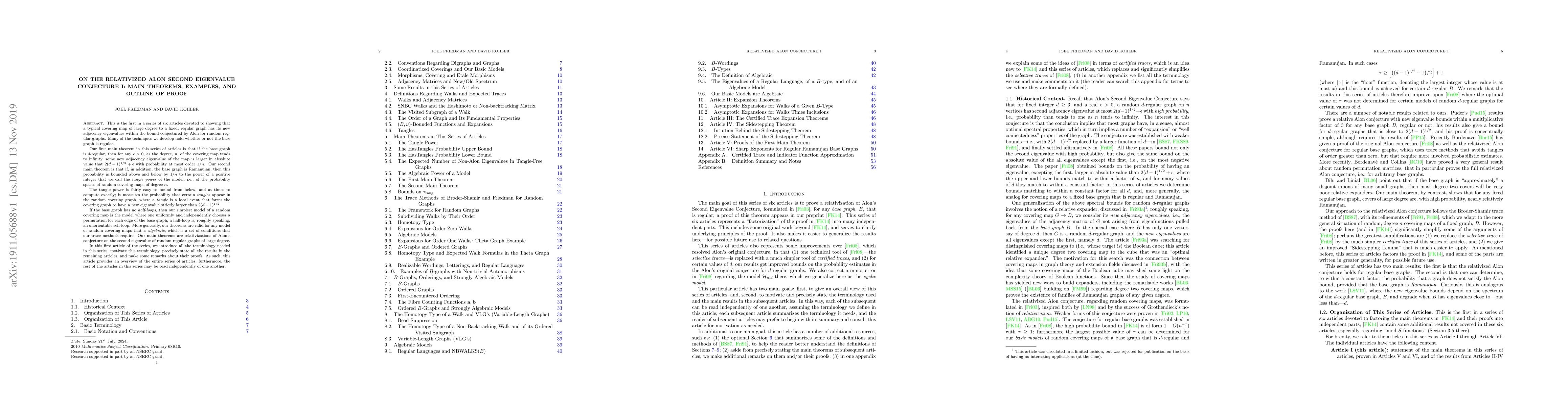 This is the first in a series of six articles devoted to showing that a typical covering map of large degree to a fixed, regular graph has its new adjacency eigenvalues within the bound conjectured by Alon for random regular graphs. Many of the techniques we develop hold whether or not the base graph is regular. Our first main theorem in this series of articles is that if the base graph is $d$-regular, then for any $\epsilon>0$, as the degree, $n$, of the covering map tends to infinity, some new adjacency eigenvalue of the map is larger in absolute value that $2(d-1)^{1/2}+\epsilon$ with probability at most order $1/n$. Our second main theorem is that if, in addition, the base graph is Ramanujan, then this probability is bounded above and below by $1/n$ to the power of a positive integer that we call the {\em tangle power} of the model, i.e., of the probability spaces of random covering maps of degree $n$. The tangle power is fairly easy to bound from below, and at times to compute exactly; it measures the probability that certain {\em tangles} appear in the random covering graph, where a {\em tangle} is a local event that forces the covering graph to have a new eigenvalue strictly larger than $2(d-1)^{1/2}$. Our main theorems are relativizations of Alon's conjecture on the second eigenvalue of random regular graphs of large degree. In this first article of the series, we introduce all the terminology needed in this series, motivate this terminology, precisely state all the results in the remaining articles, and make some remarks about their proofs. As such, this article provides an overview of the entire series of articles; furthermore, the rest of the articles in this series may be read independently of one another.