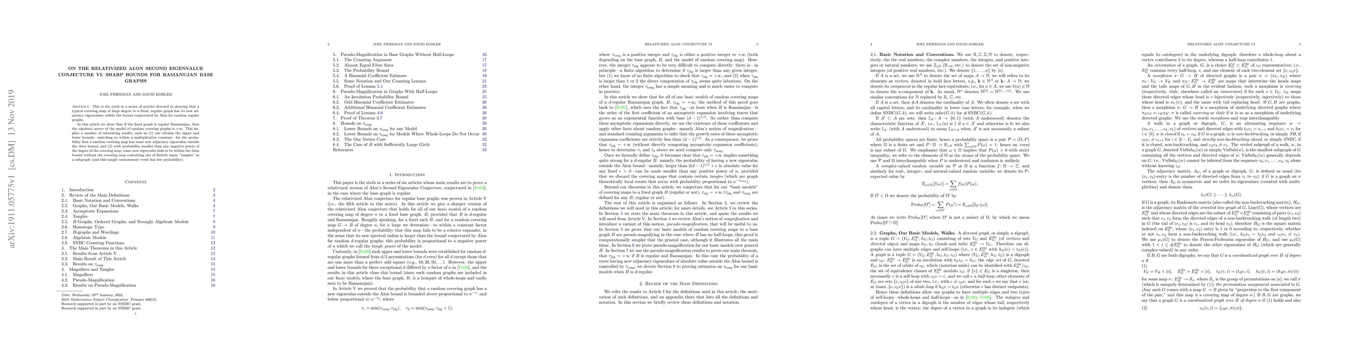 This is the sixth in a series of articles devoted to showing that a typical covering map of large degree to a fixed, regular graph has its new adjacency eigenvalues within the bound conjectured by Alon for random regular graphs. In this article we show that if the fixed graph is regular Ramanujan, then the {\em algebraic power} of the model of random covering graphs is $+\infty$. This implies a number of interesting results, such as (1) one obtains the upper and lower bounds---matching to within a multiplicative constant---for the probability that a random covering map has some new adjacency eigenvalue outside the Alon bound, and (2) with probability smaller than any negative power of the degree of the covering map, some new eigenvalue fails to be within the Alon bound without the covering map containing one of finitely many "tangles" as a subgraph (and this tangle containment event has low probability).