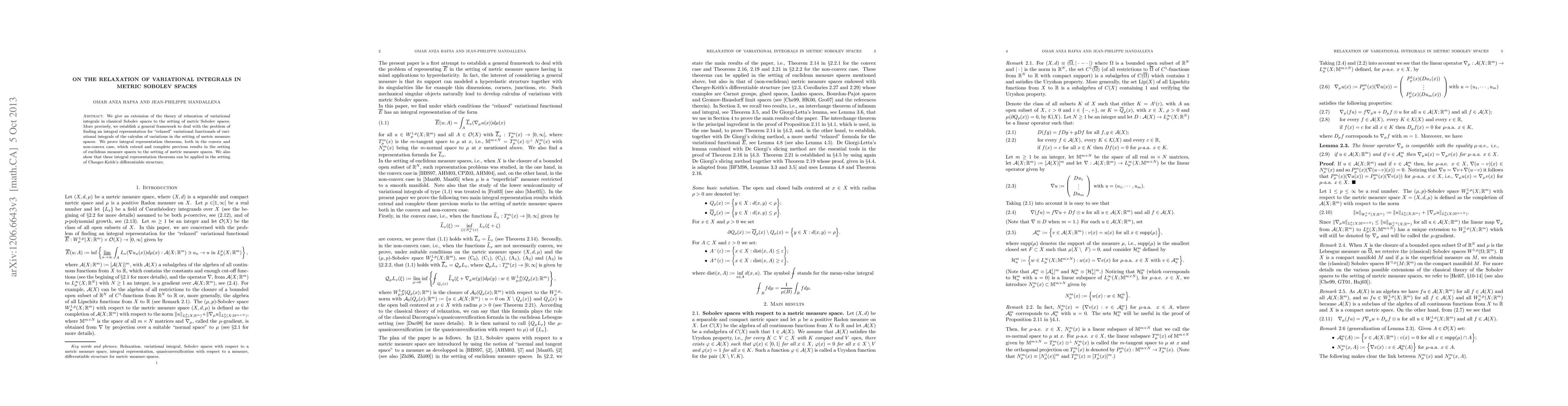 This paper extends the theory of variational integrals relaxation from classical to metric Sobolev spaces, establishing a framework for finding integral representations of relaxed functionals in metric measure spaces. It proves integral representation theorems applicable to both convex and non-convex cases, extending previous results from Euclidean to general metric spaces, including Cheeger-Keith's differentiable structure.