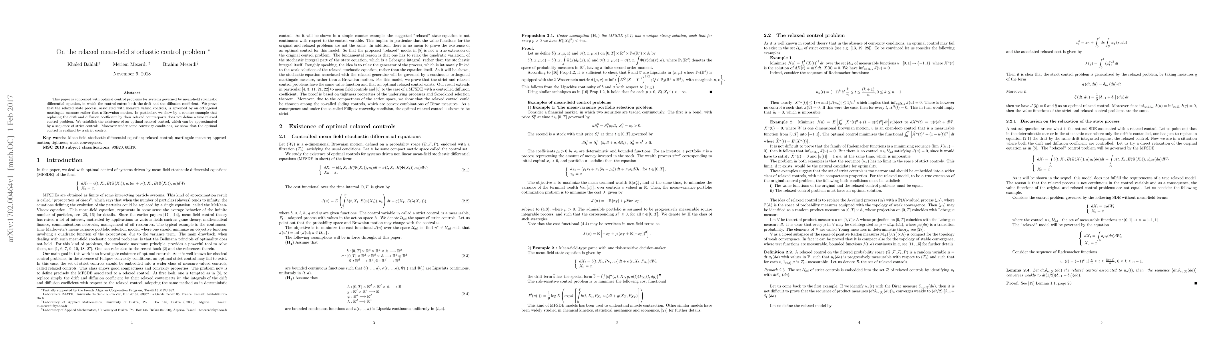 This paper addresses optimal control for systems governed by mean-field stochastic differential equations, proving the existence of an optimal relaxed control approximated by strict controls. It also demonstrates that replacing drift and diffusion coefficients with relaxed counterparts does not define a true relaxed control problem.