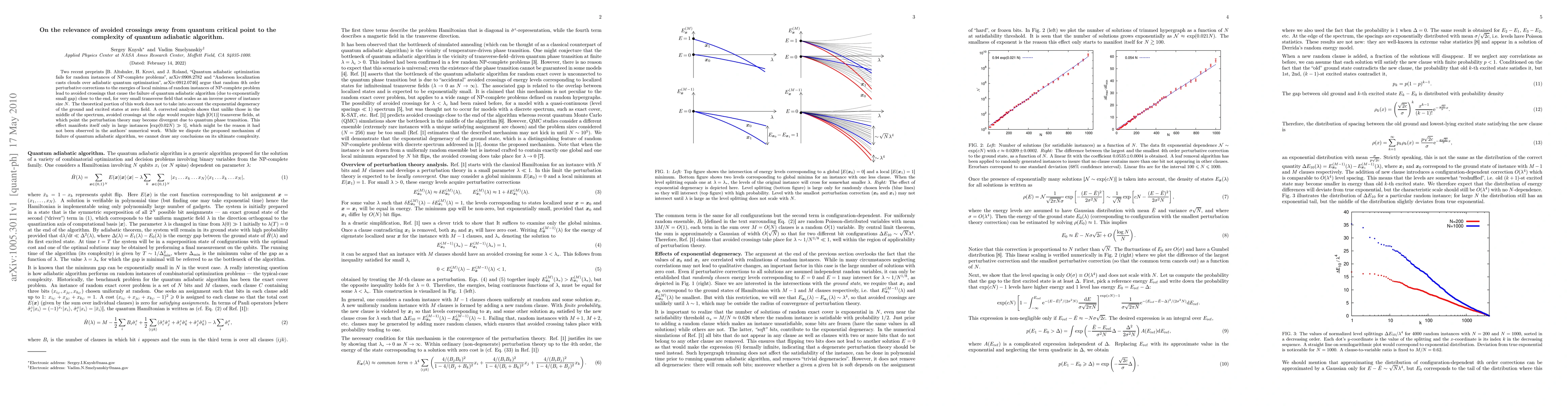 Two recent preprints [B. Altshuler, H. Krovi, and J. Roland, "Quantum adiabatic optimization fails for random instances of NP-complete problems", arXiv:0908.2782 and "Anderson localization casts clouds over adiabatic quantum optimization", arXiv:0912.0746] argue that random 4th order perturbative corrections to the energies of local minima of random instances of NP-complete problem lead to avoided crossings that cause the failure of quantum adiabatic algorithm (due to exponentially small gap) close to the end, for very small transverse field that scales as an inverse power of instance size N. The theoretical portion of this work does not to take into account the exponential degeneracy of the ground and excited states at zero field. A corrected analysis shows that unlike those in the middle of the spectrum, avoided crossings at the edge would require high [O(1)] transverse fields, at which point the perturbation theory may become divergent due to quantum phase transition. This effect manifests itself only in large instances [exp(0.02 N) >> 1], which might be the reason it had not been observed in the authors' numerical work. While we dispute the proposed mechanism of failure of quantum adiabatic algorithm, we cannot draw any conclusions on its ultimate complexity.