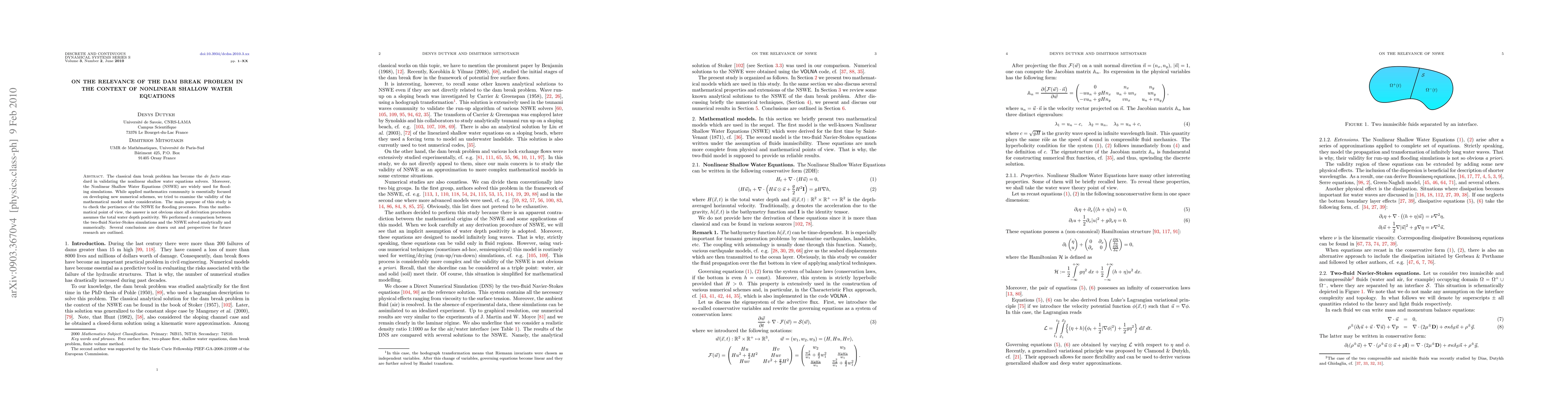 The classical dam break problem has become the de facto standard in validating the Nonlinear Shallow Water Equations (NSWE) solvers. Moreover, the NSWE are widely used for flooding simulations. While applied mathematics community is essentially focused on developing new numerical schemes, we tried to examine the validity of the mathematical model under consideration. The main purpose of this study is to check the pertinence of the NSWE for flooding processes. From the mathematical point of view, the answer is not obvious since all derivation procedures assumes the total water depth positivity. We performed a comparison between the two-fluid Navier-Stokes simulations and the NSWE solved analytically and numerically. Several conclusions are drawn out and perspectives for future research are outlined.