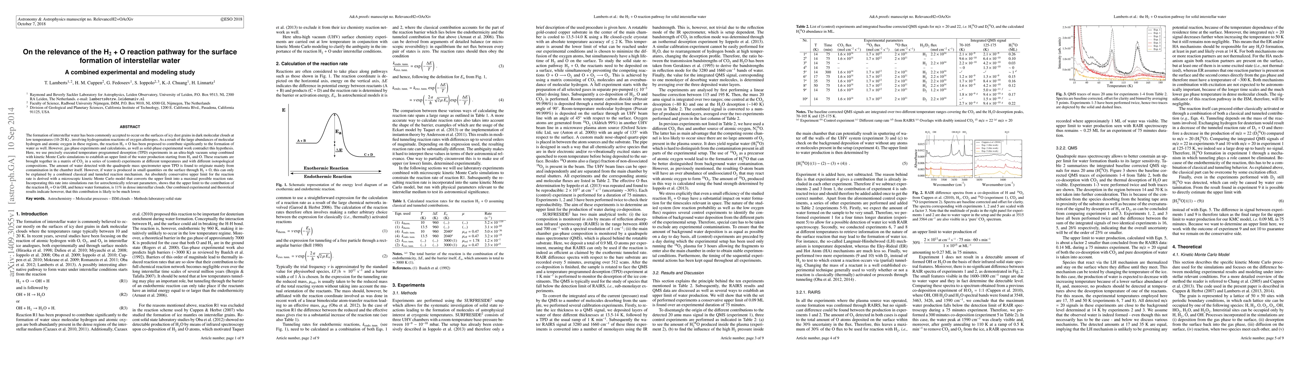The formation of interstellar water has been commonly accepted to occur on the surfaces of icy dust grains in dark molecular clouds at low temperatures (10-20 K), involving hydrogenation reactions of oxygen allotropes. As a result of the large abundances of molecular hydrogen and atomic oxygen in these regions, the reaction H2 + O has been proposed to contribute significantly to the formation of water as well. However, gas phase experiments and calculations, as well as solid-phase experimental work contradict this hypothesis. Here, we use precisely executed temperature programmed desorption (TPD) experiments in an ultra-high vacuum setup combined with kinetic Monte Carlo simulations to establish an upper limit of the water production starting from H2 and O. These reactants are brought together in a matrix of CO2 in a series of (control) experiments at different temperatures and with different isotopological compositions. The amount of water detected with the quadrupole mass spectrometer upon TPD is found to originate mainly from contamination in the chamber itself. However, if water is produced in small quantities on the surface through H2 + O, this can only be explained by a combined classical and tunneled reaction mechanism. An absolutely conservative upper limit for the reaction rate is derived with a microscopic kinetic Monte Carlo model that converts the upper limit into a maximal possible reaction rate. Incorporating this rate into simulations run for astrochemically relevant parameters, shows that the upper limit to the contribution of the reaction H2 + O in OH, and hence water formation, is 11% in dense interstellar clouds. Our combined experimental and theoretical results indicate however, that this contribution is likely to be much lower.