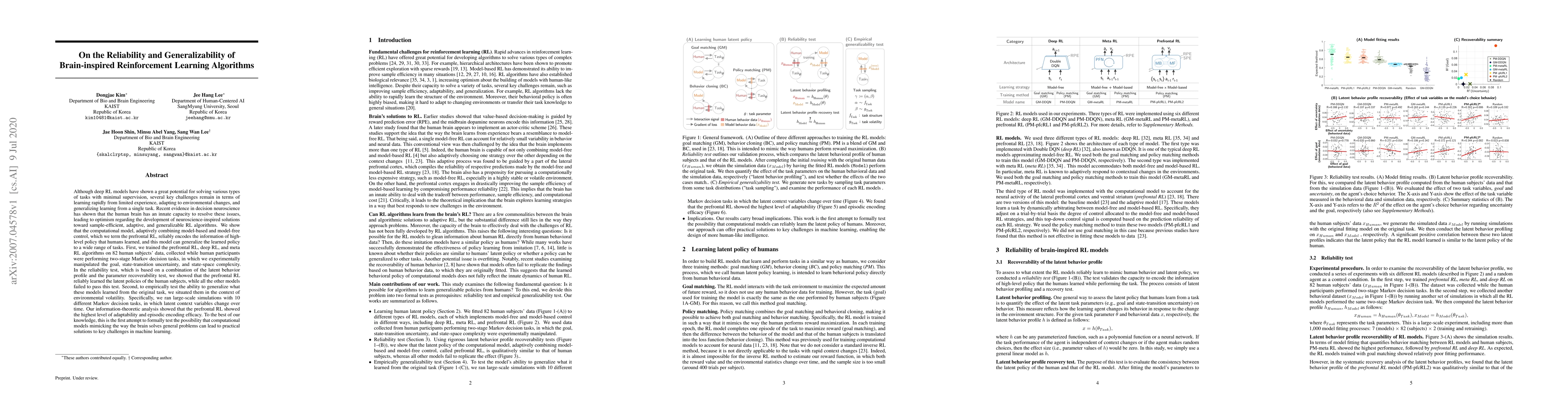 Although deep RL models have shown a great potential for solving various types of tasks with minimal supervision, several key challenges remain in terms of learning from limited experience, adapting to environmental changes, and generalizing learning from a single task. Recent evidence in decision neuroscience has shown that the human brain has an innate capacity to resolve these issues, leading to optimism regarding the development of neuroscience-inspired solutions toward sample-efficient, and generalizable RL algorithms. We show that the computational model combining model-based and model-free control, which we term the prefrontal RL, reliably encodes the information of high-level policy that humans learned, and this model can generalize the learned policy to a wide range of tasks. First, we trained the prefrontal RL, and deep RL algorithms on 82 subjects' data, collected while human participants were performing two-stage Markov decision tasks, in which we manipulated the goal, state-transition uncertainty and state-space complexity. In the reliability test, which includes the latent behavior profile and the parameter recoverability test, we showed that the prefrontal RL reliably learned the latent policies of the humans, while all the other models failed. Second, to test the ability to generalize what these models learned from the original task, we situated them in the context of environmental volatility. Specifically, we ran large-scale simulations with 10 Markov decision tasks, in which latent context variables change over time. Our information-theoretic analysis showed that the prefrontal RL showed the highest level of adaptability and episodic encoding efficacy. This is the first attempt to formally test the possibility that computational models mimicking the way the brain solves general problems can lead to practical solutions to key challenges in machine learning.