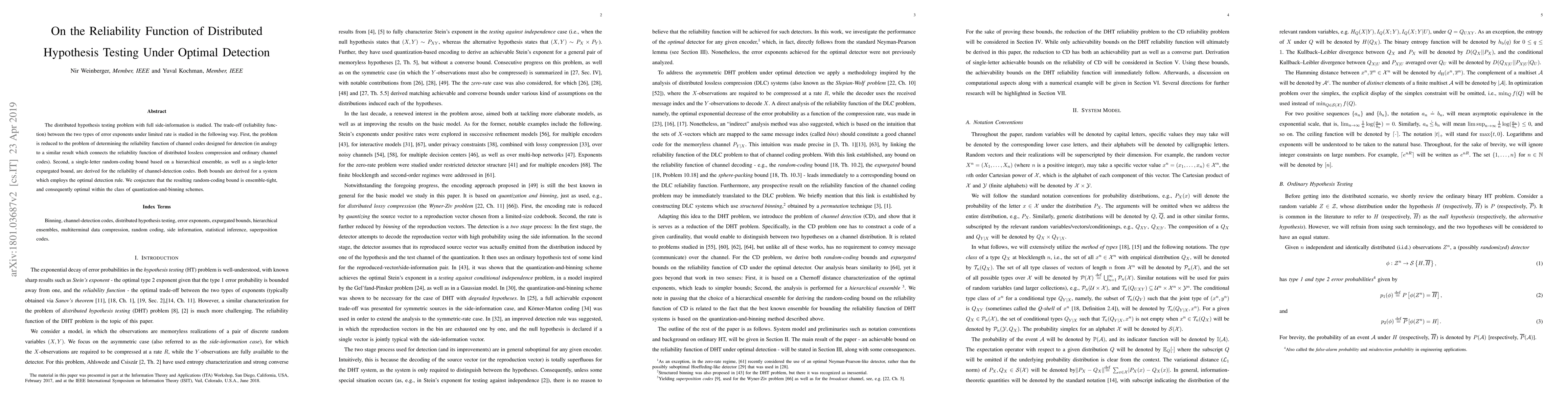 This paper explores the reliability function in distributed hypothesis testing with full side-information, deriving single-letter bounds for optimal detection. It conjectures that the derived random-coding bound is optimal for quantization-and-binning schemes.