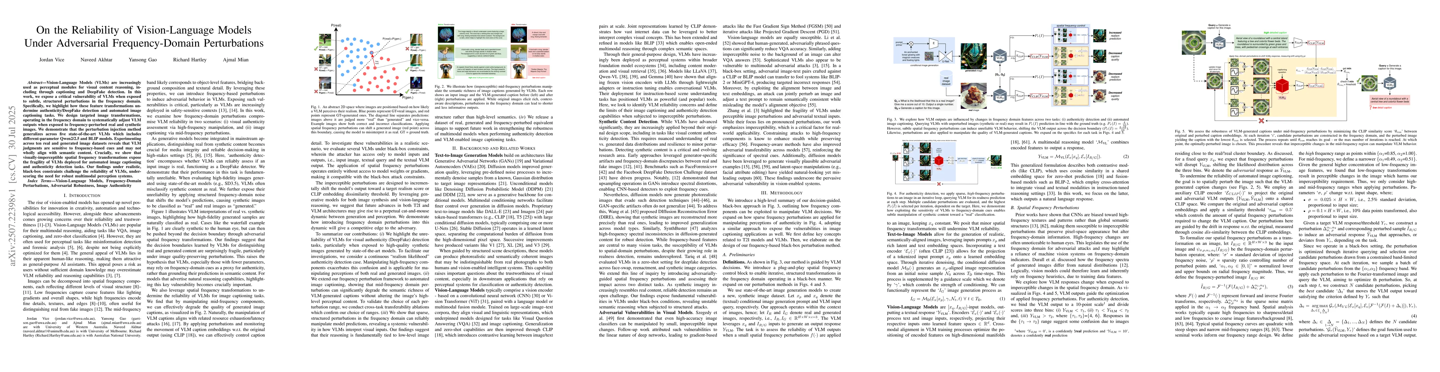 Vision-Language Models (VLMs) are increasingly used as perceptual modules for visual content reasoning, including through captioning and DeepFake detection. In this work, we expose a critical vulnerability of VLMs when exposed to subtle, structured perturbations in the frequency domain. Specifically, we highlight how these feature transformations undermine authenticity/DeepFake detection and automated image captioning tasks. We design targeted image transformations, operating in the frequency domain to systematically adjust VLM outputs when exposed to frequency-perturbed real and synthetic images. We demonstrate that the perturbation injection method generalizes across five state-of-the-art VLMs which includes different-parameter Qwen2/2.5 and BLIP models. Experimenting across ten real and generated image datasets reveals that VLM judgments are sensitive to frequency-based cues and may not wholly align with semantic content. Crucially, we show that visually-imperceptible spatial frequency transformations expose the fragility of VLMs deployed for automated image captioning and authenticity detection tasks. Our findings under realistic, black-box constraints challenge the reliability of VLMs, underscoring the need for robust multimodal perception systems.