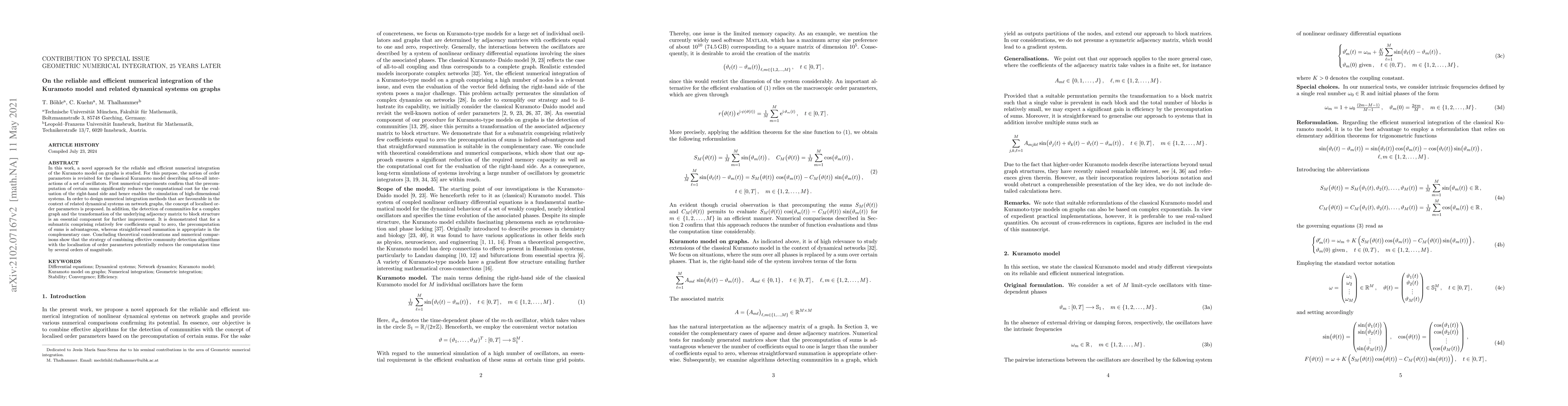 In this work, a novel approach for the reliable and efficient numerical integration of the Kuramoto model on graphs is studied. For this purpose, the notion of order parameters is revisited for the classical Kuramoto model describing all-to-all interactions of a set of oscillators. First numerical experiments confirm that the precomputation of certain sums significantly reduces the computational cost for the evaluation of the right-hand side and hence enables the simulation of high-dimensional systems. In order to design numerical integration methods that are favourable in the context of related dynamical systems on network graphs, the concept of localised order parameters is proposed. In addition, the detection of communities for a complex graph and the transformation of the underlying adjacency matrix to block structure is an essential component for further improvement. It is demonstrated that for a submatrix comprising relatively few coefficients equal to zero, the precomputation of sums is advantageous, whereas straightforward summation is appropriate in the complementary case. Concluding theoretical considerations and numerical comparisons show that the strategy of combining effective community detection algorithms with the localisation of order parameters potentially reduces the computation time by several orders of magnitude.
