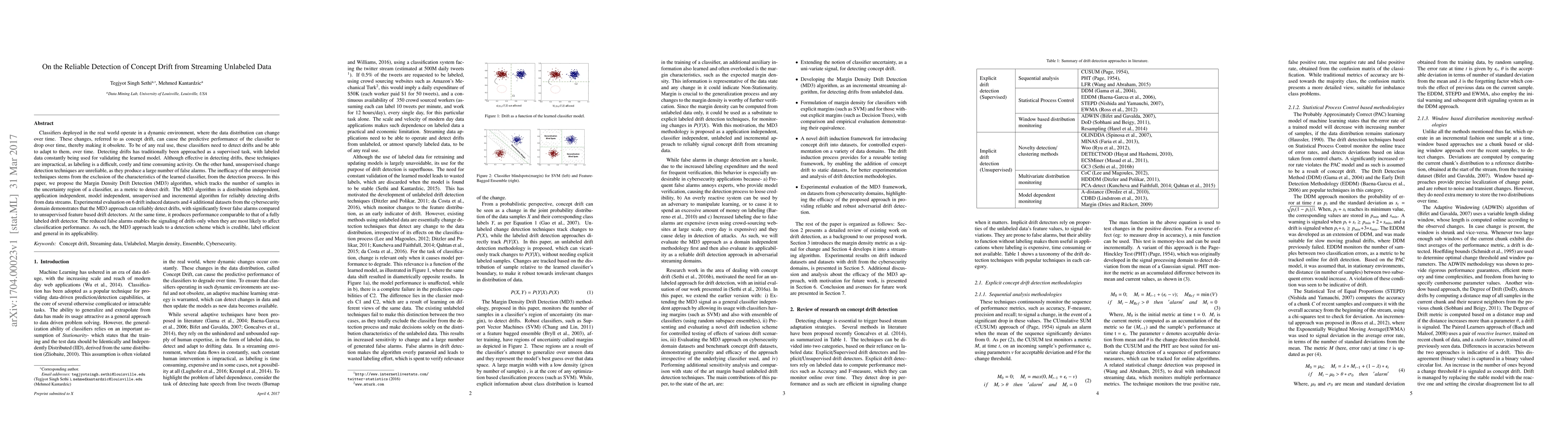 This paper proposes the Margin Density Drift Detection (MD3) algorithm for reliably detecting concept drift in streaming unlabeled data. Unlike traditional supervised methods, MD3 is an unsupervised, incremental approach that tracks samples in the uncertainty region of a classifier, achieving fewer false alarms and better adaptability to real-world dynamic environments.